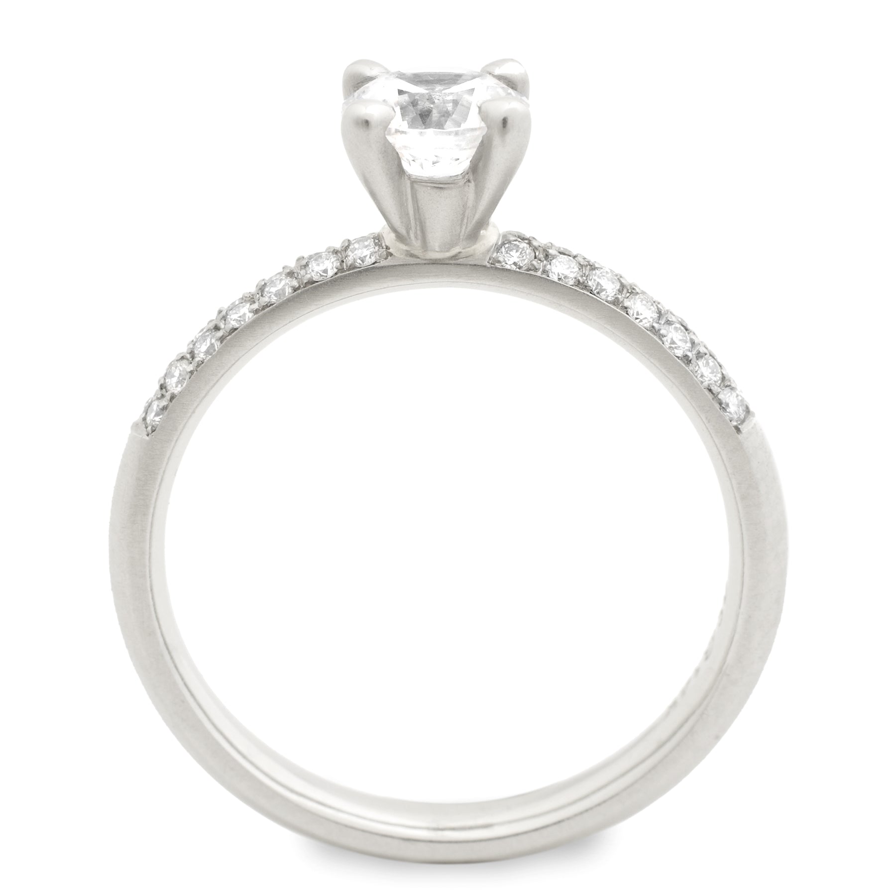 Here Anne has taken the classic 4 claw setting and used her subtle hand to update this timeless mount, presenting a dainty yet bold design. Set in the 4 claws, this mounting will hold a 0.25-1ct center diamond, with the ~28 x 0.008 ct diamonds pave set on the shoulders adding the final glittering touch.