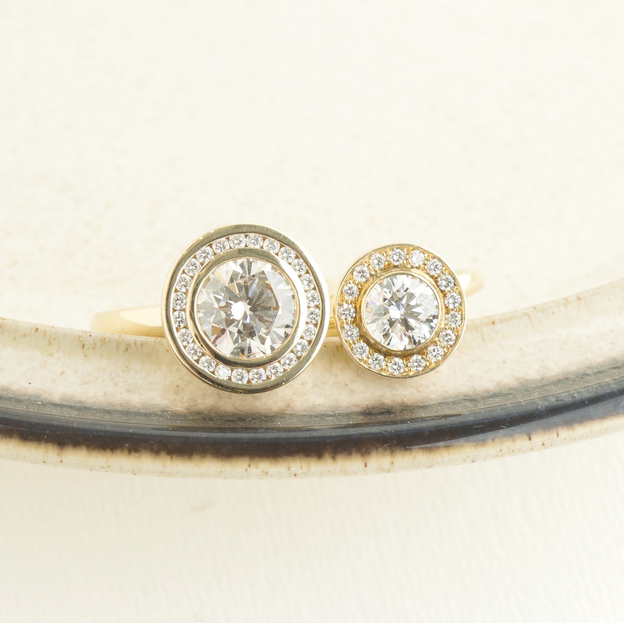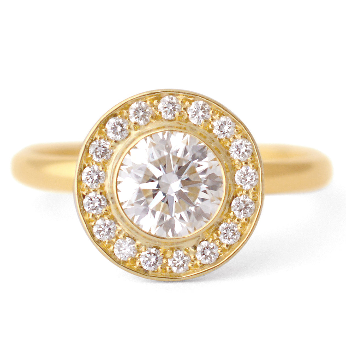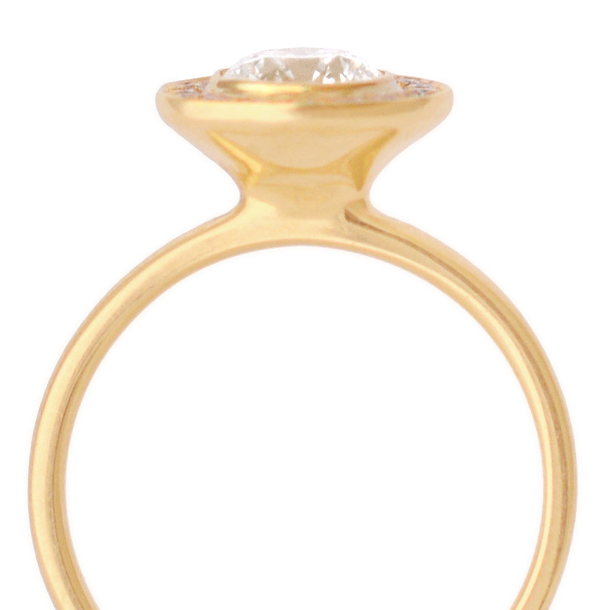 One of a Kind 18k yellow gold "Martini" style ring with bezel set 0.91ct round brilliant cut center diamond and diamond halo.