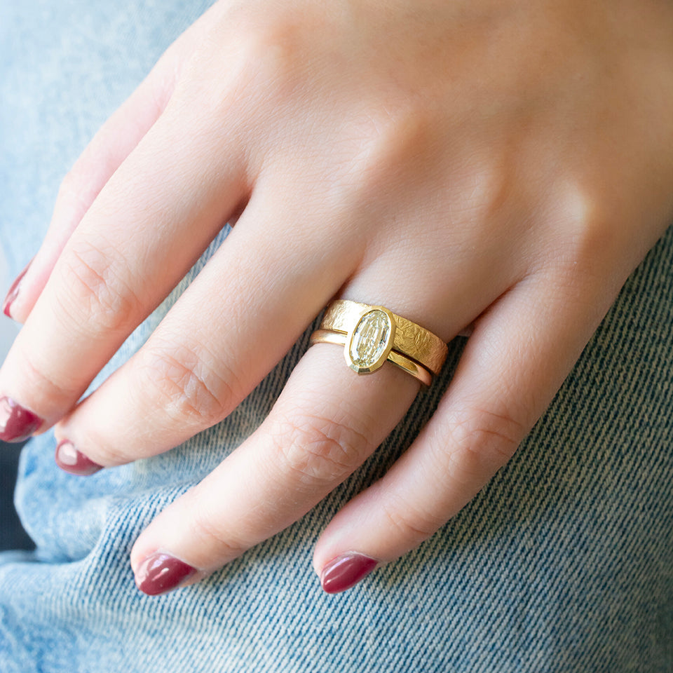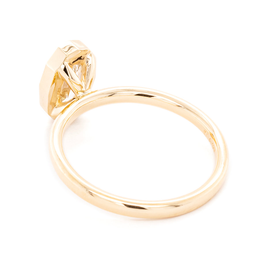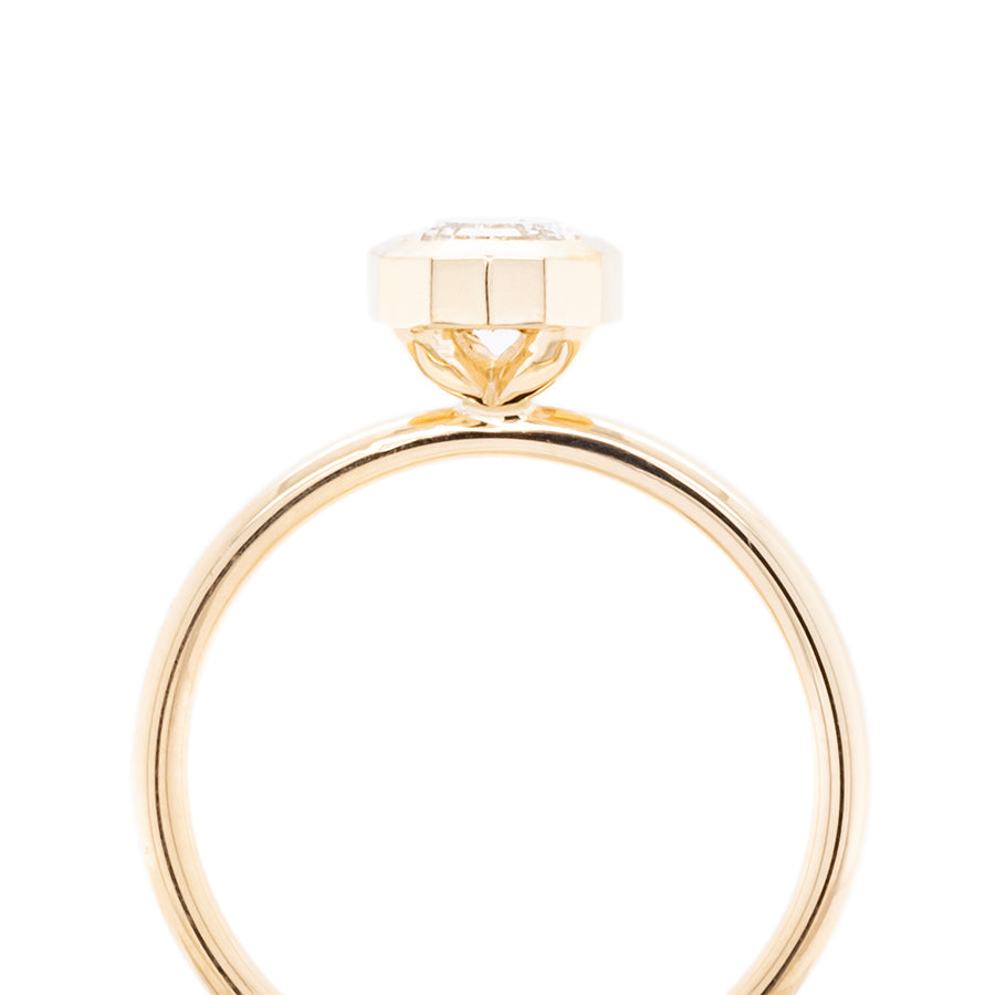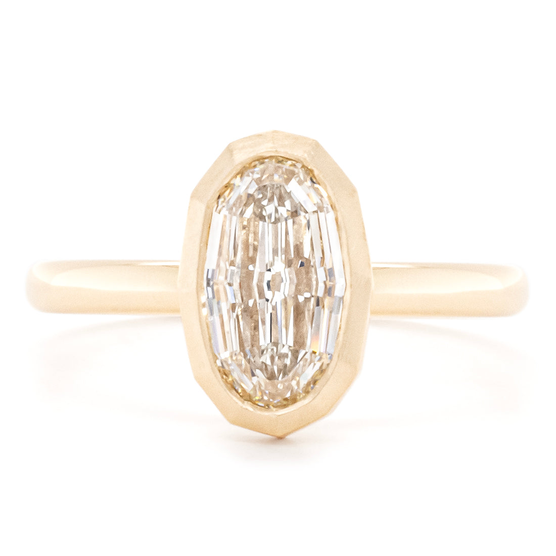 Delightfully warm in color, this unique modern 'Geo' cut Oval diamond is set in our classic 'Annie' cage bezel mount.
