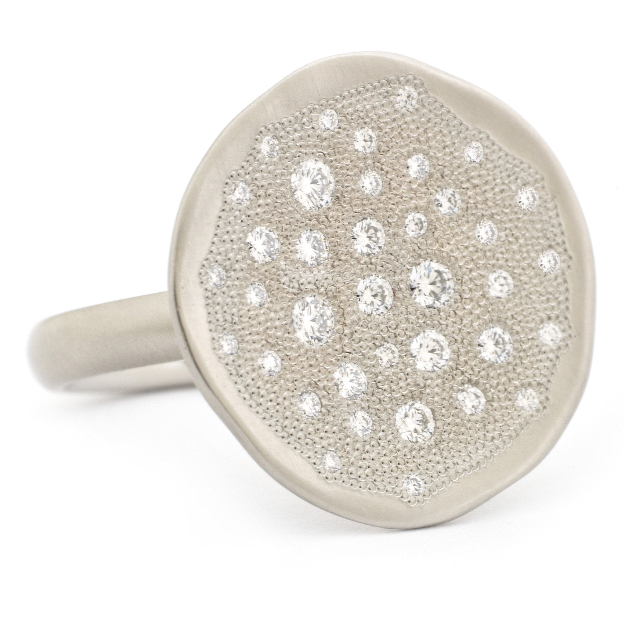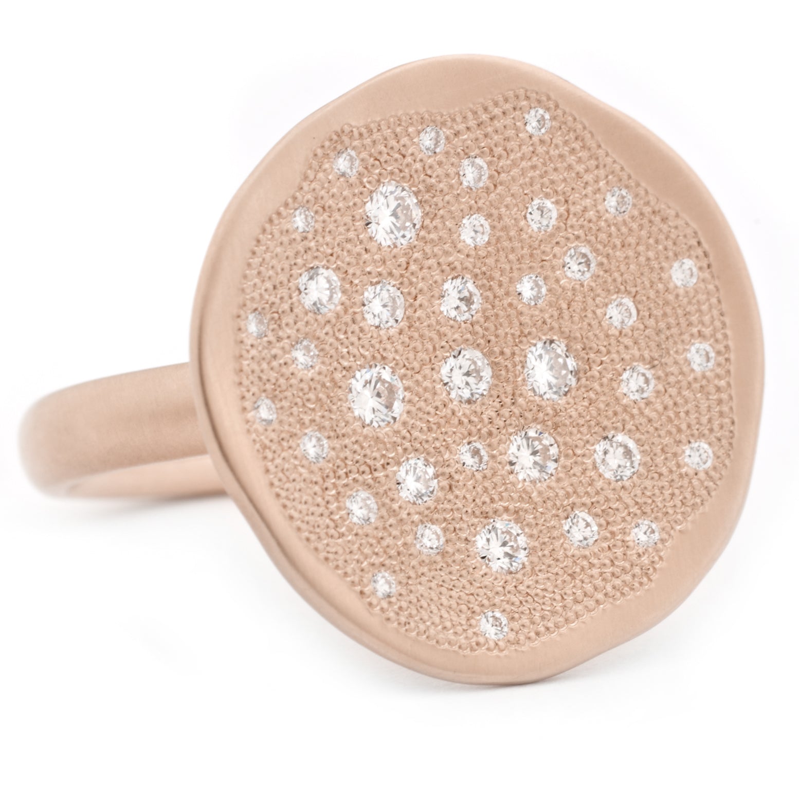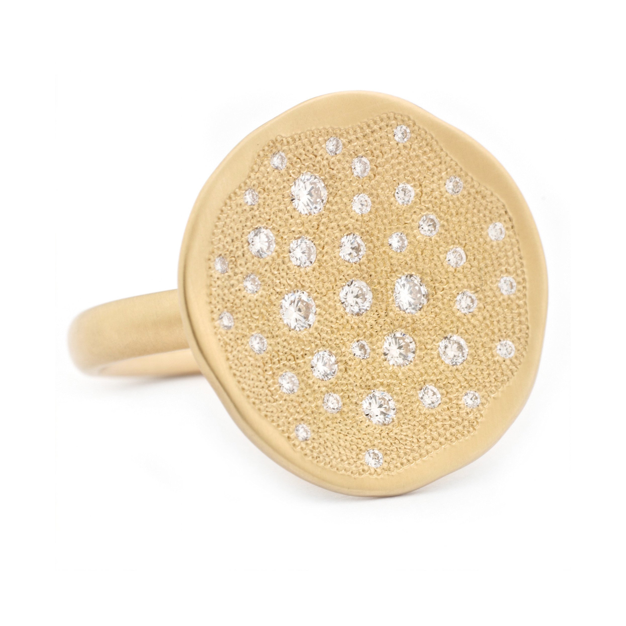 The matte, beaded texture of the ~20mm gold disc is a perfect contrast to the brilliant sparkle of the various sized white diamonds pave set across the surface. An organic edge of un-textured gold around the rim of the disc helps accentuate the materials and textures within. Set with 37 round brilliant cut G/VS diamonds of varying size ~0.51tcw. Band ~3mm wide.