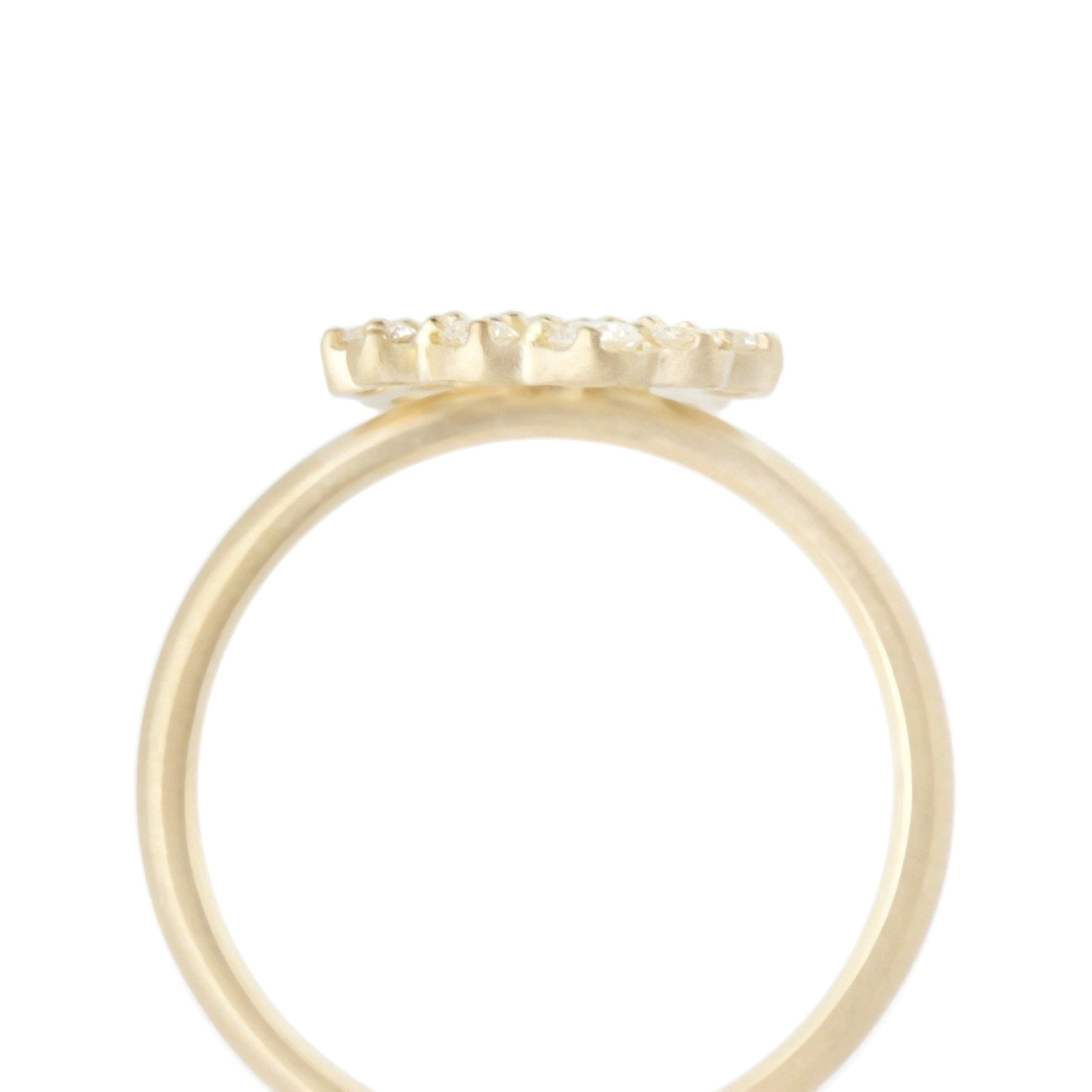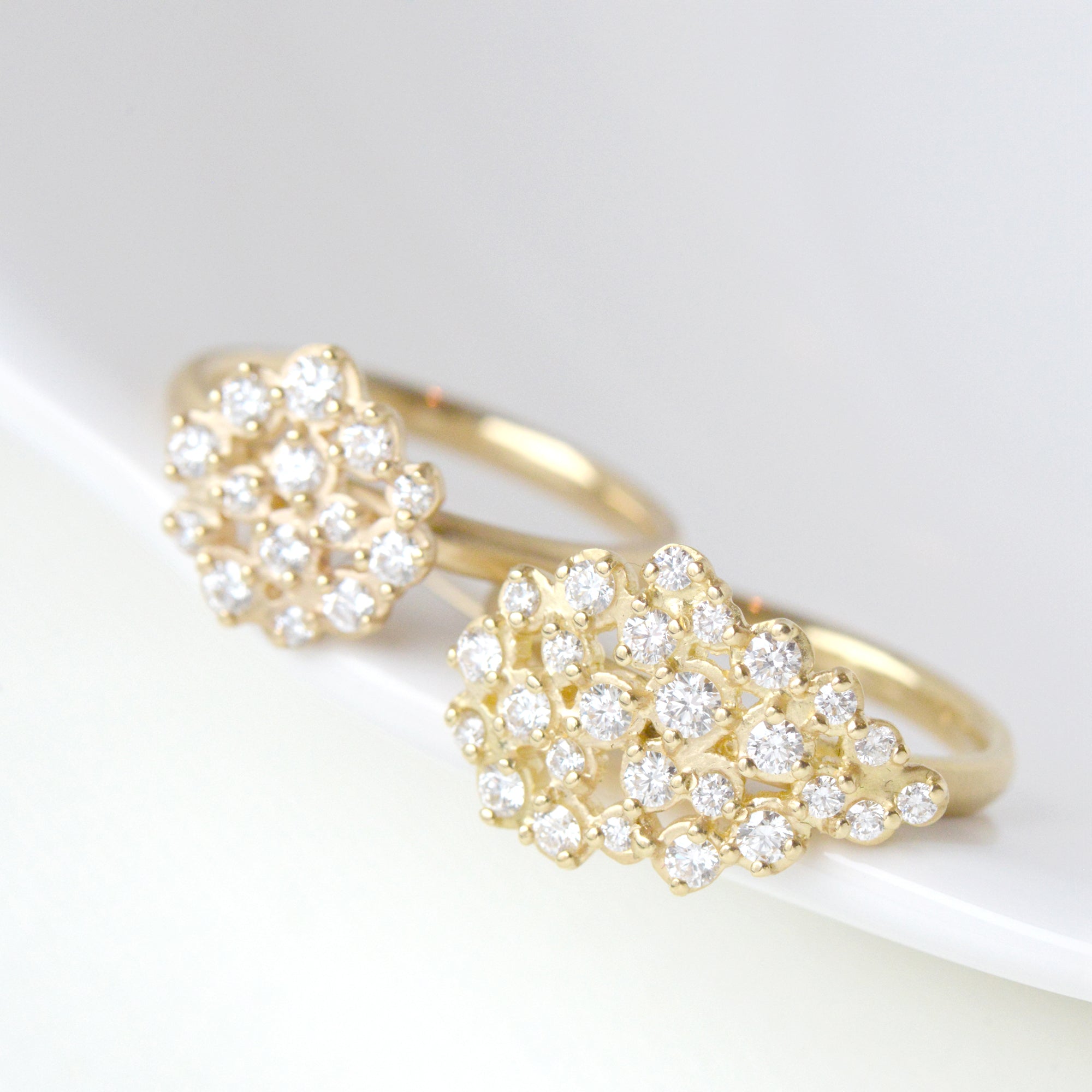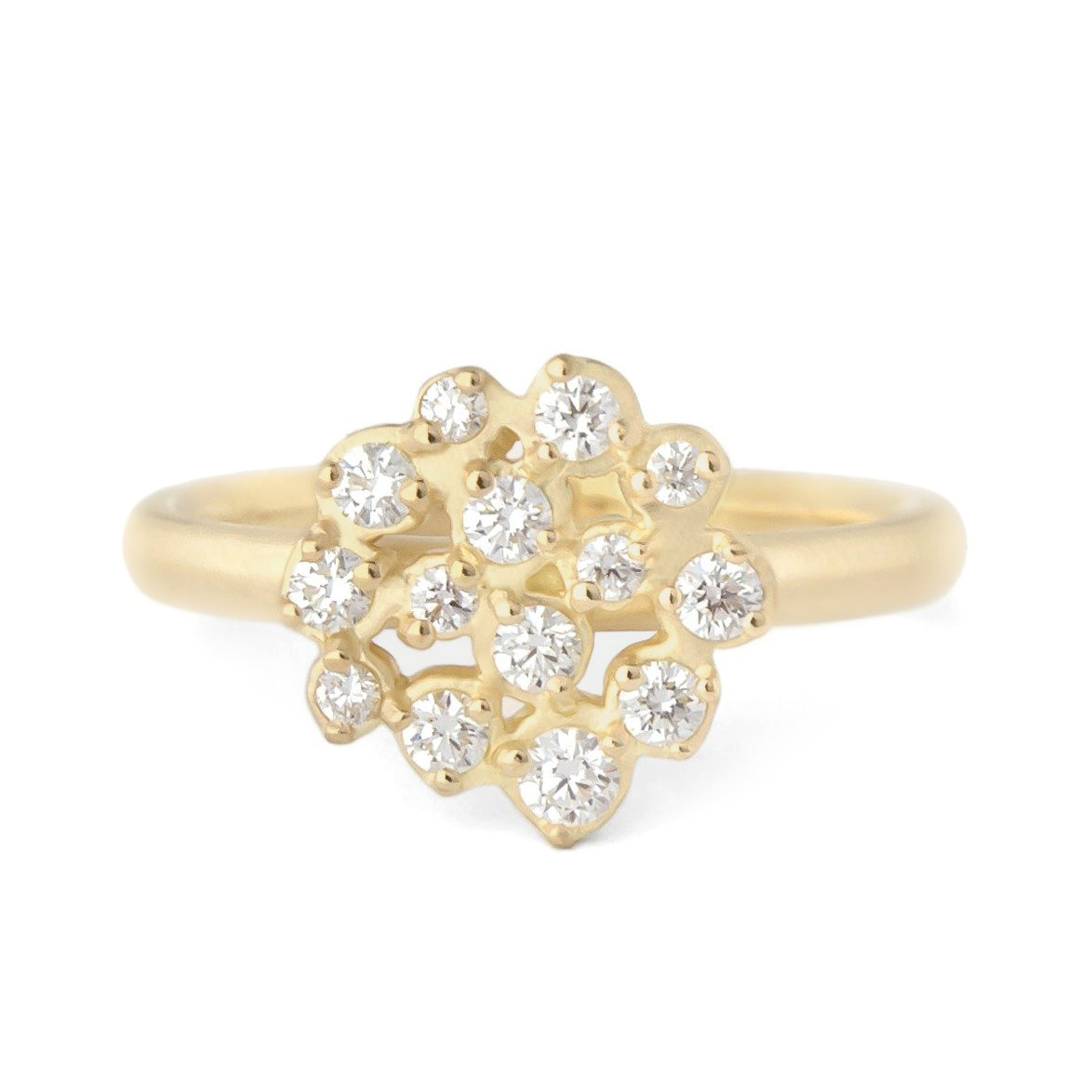 'Festival' Gold ring with medium cluster (~11mm) of 14 x varying sizes of round brilliant cut G/VS diamonds, band ~2mm wide. ~0.36 total diamond carat weight.