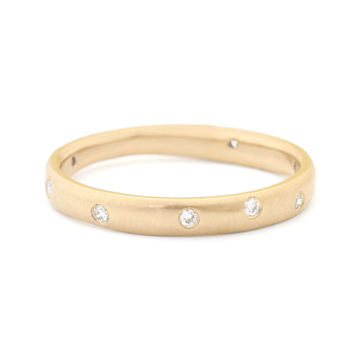 Gold wonky band with 9 x 0.01ct diamonds bezel set throughout.