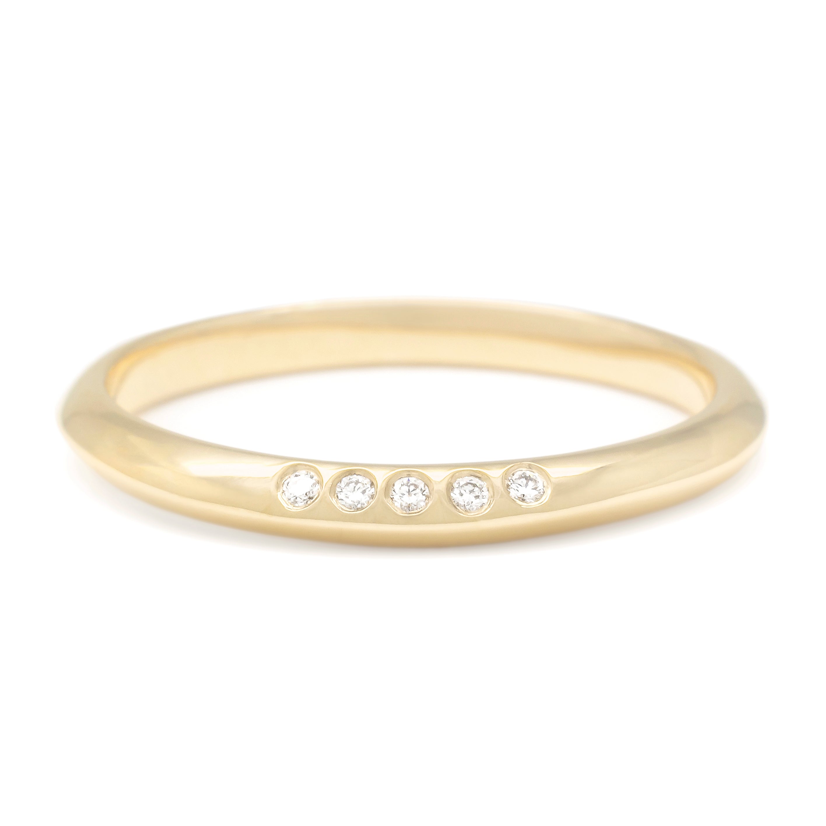 Gold soft knife edge band (2mm) with cluster of 5 x 0.004ct round brilliant cut diamonds flush set on side edge. High polish.