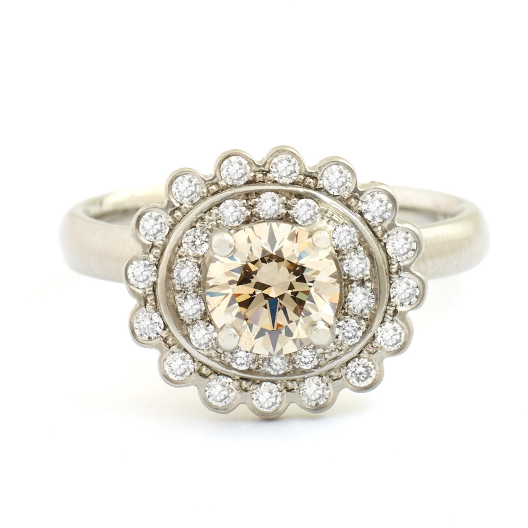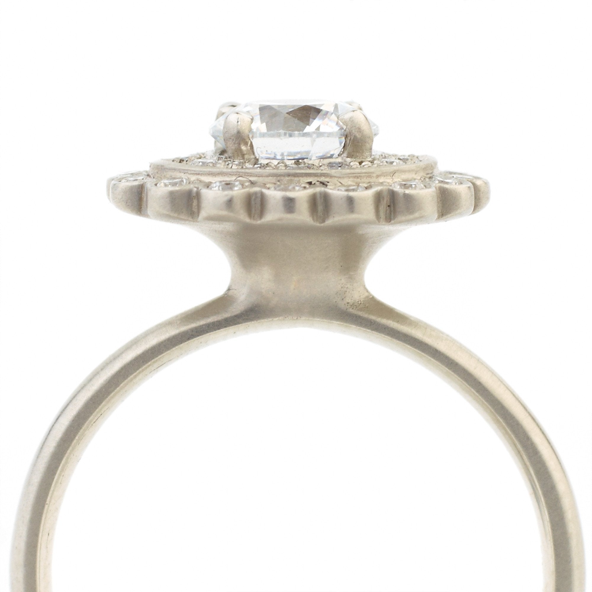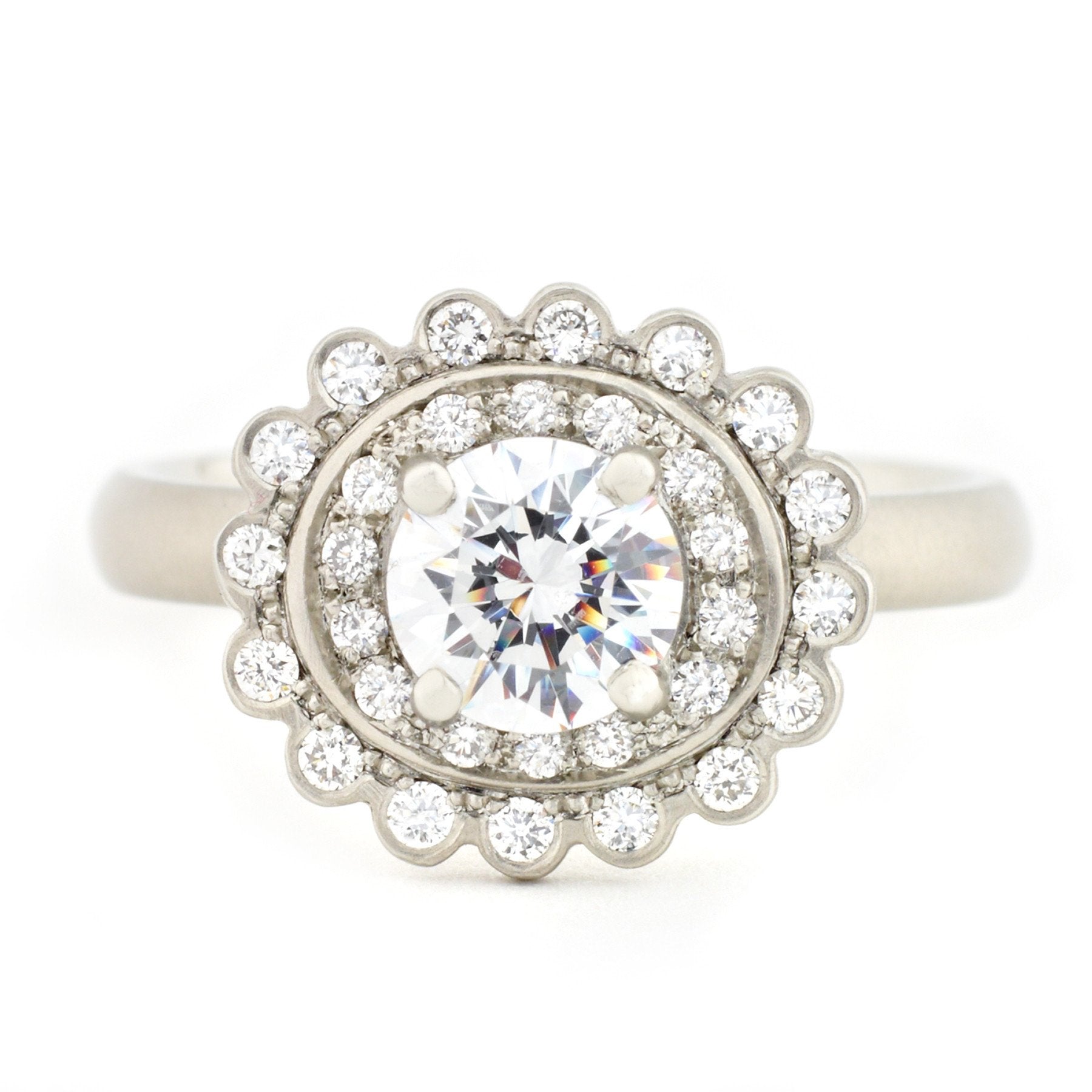 Feminine and intricate, the Scalloped Engagement Ring boasts an oval 4 claw Halo mount for a 0.50-1.5ct round brilliant cut stone. One of our premiere bridal rings, this attractive piece highlights the past and gives a glimpse of the dazzling future. With a stunning diamond set scalloped edge, this unique engagement ring is sure to make a brilliant presentation.