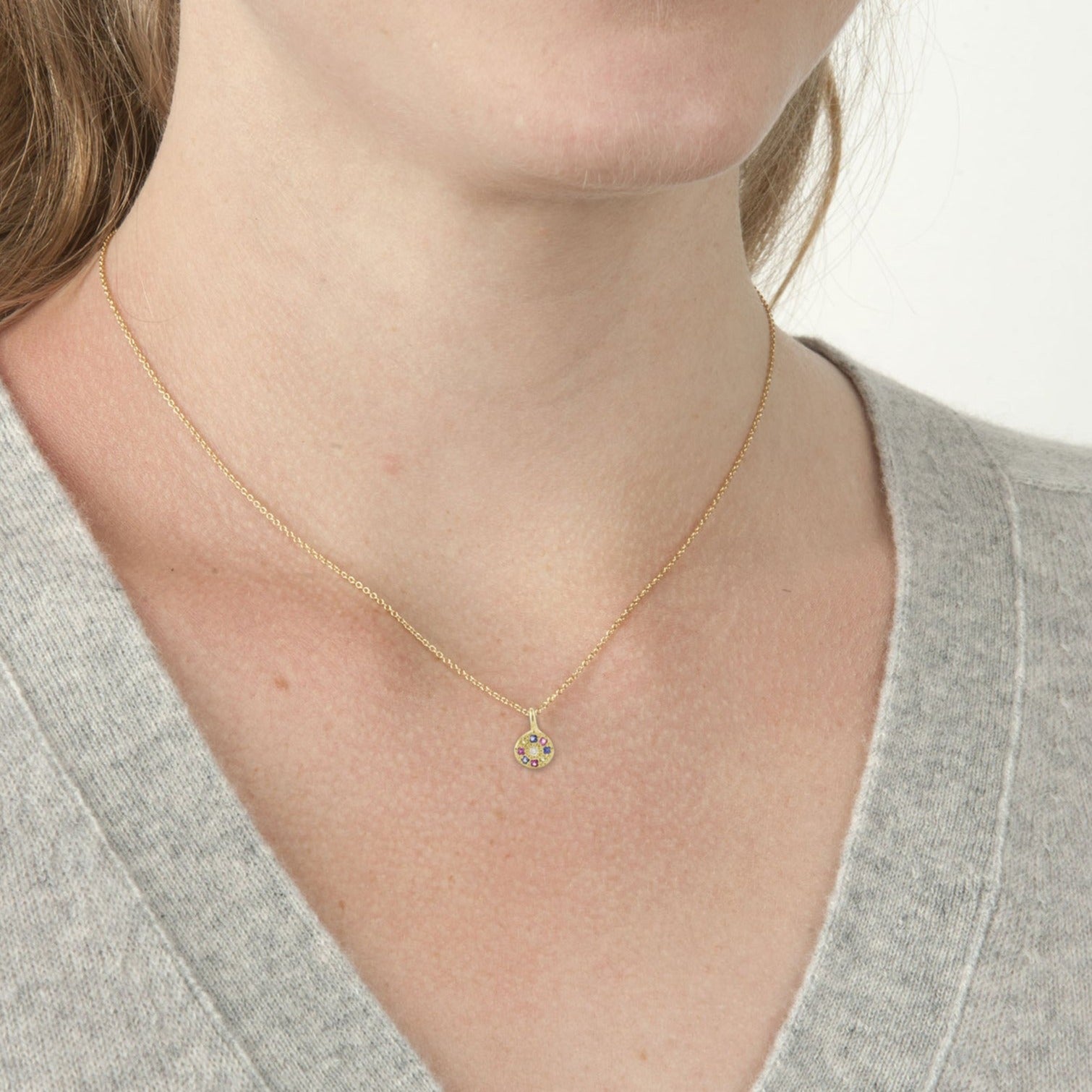 A sweet gold charm set with multi-color sapphires on a fine cable chain.
