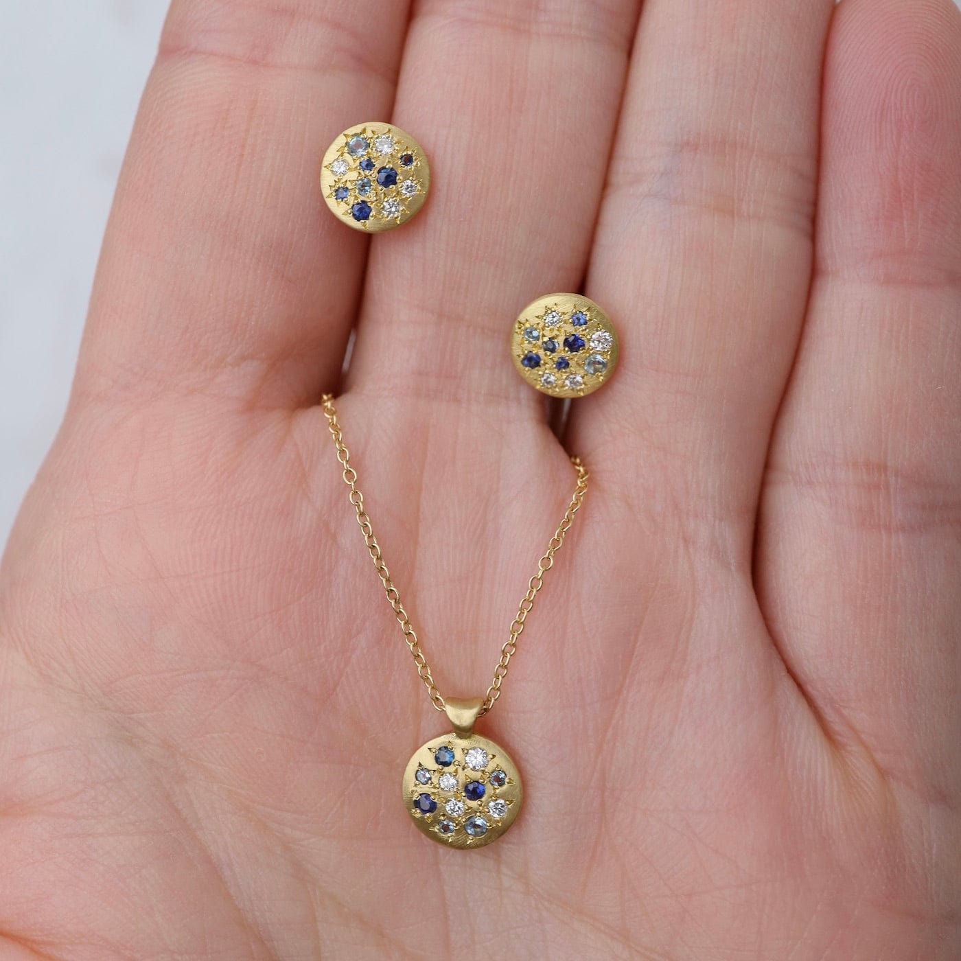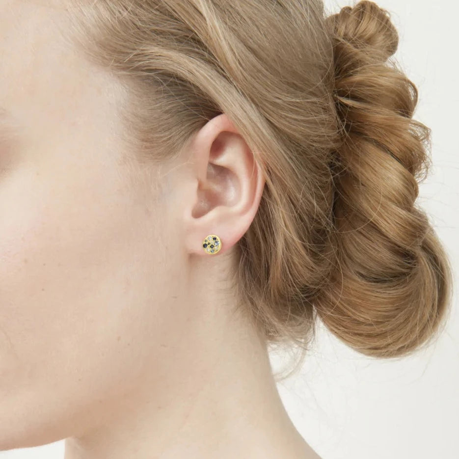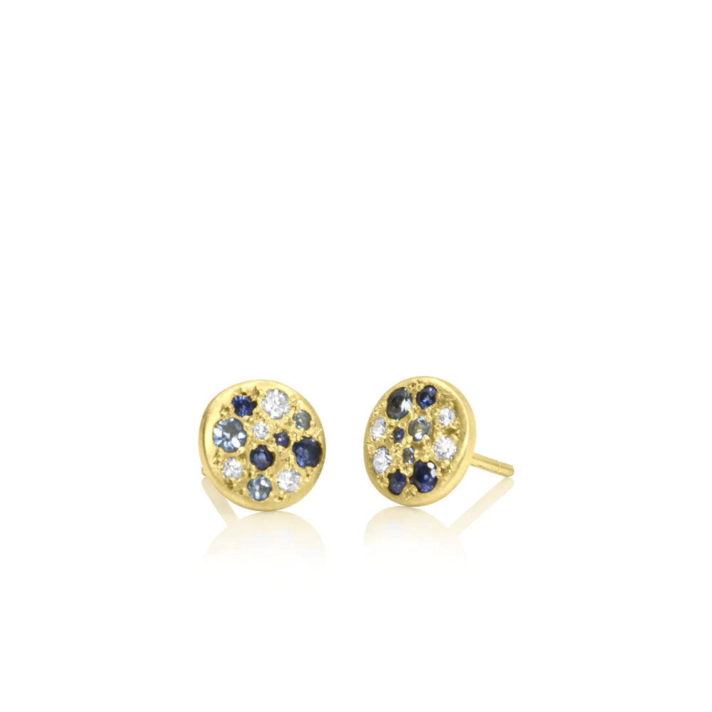 18k Yellow gold stud earrings set with diamonds, aquamarines and sapphires in a cluster-like pattern.