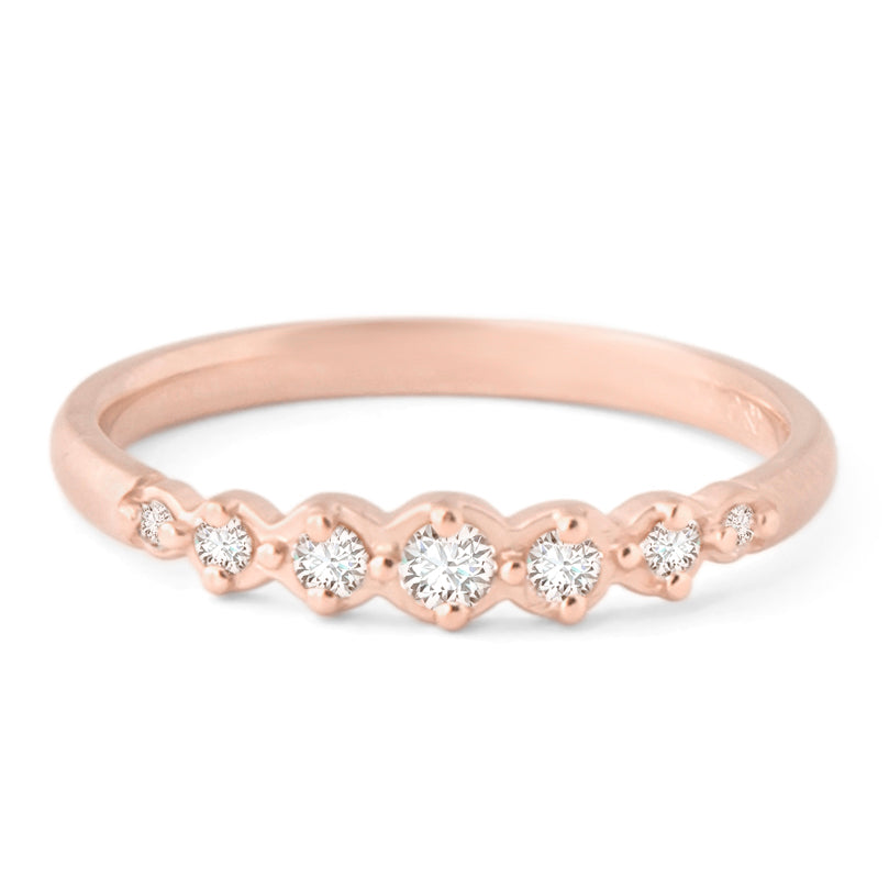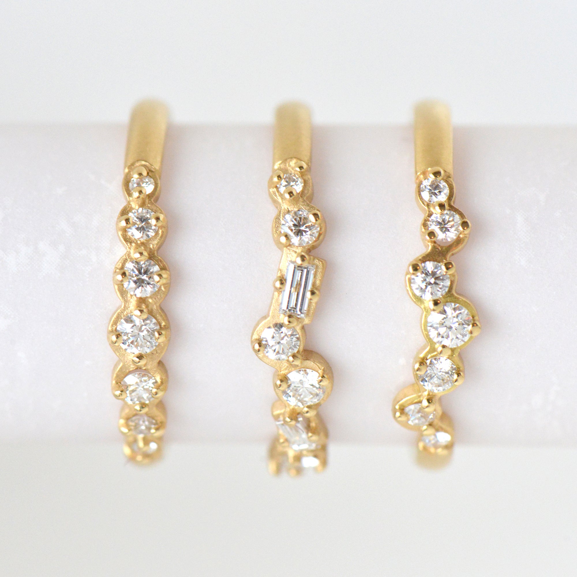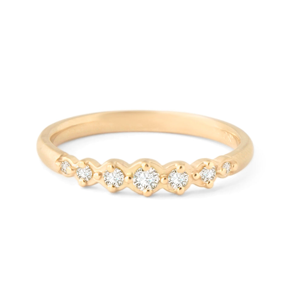 Gold 'Festival' inline graduated diamonds stacking band with varying sizes of round brilliant cut G/VS diamonds, band ~2mm wide. ~0.17 total carat weight.
