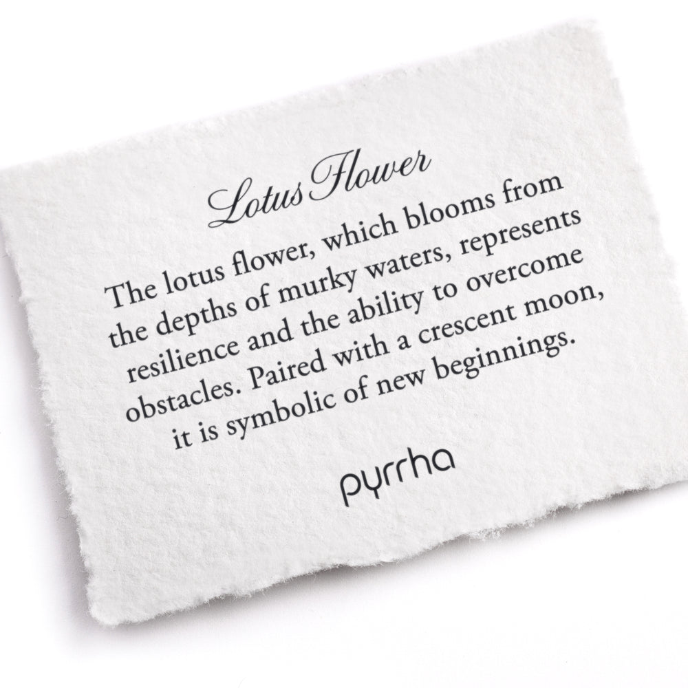 The lotus flower, which blooms from the depths of murky waters, represents resilience and the ability to overcome obstacles. Paired with a crescent moon, it is symbolic of new beginnings.