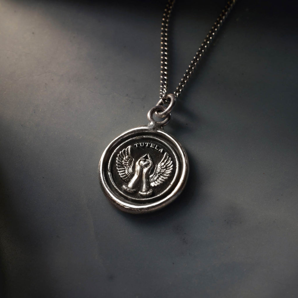 This talisman reads 'Tutela' in Latin, meaning 'Protection.' The hands cradling a heart symbolize nurturing support, while the wings represent a protective embrace.