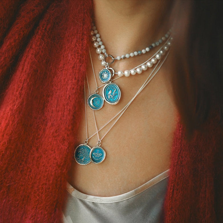 The bluebird and lily of the valley on this talisman are uplifting symbols of joy. They encourage the wearer to embrace the notion that happiness may ebb and flow, but always returns in time.