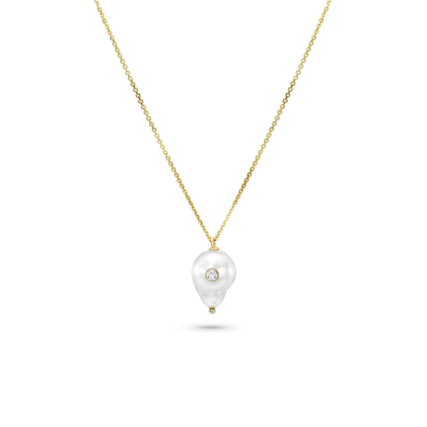 Simple and imperfectly perfect, the baby baroque necklace is a little cloudburst of everyday luxury. Set with a 2mm natural diamond, this necklace beautifully accents the collarbone on bare skin, but has enough presence to layer over higher necklines for more casual looks.