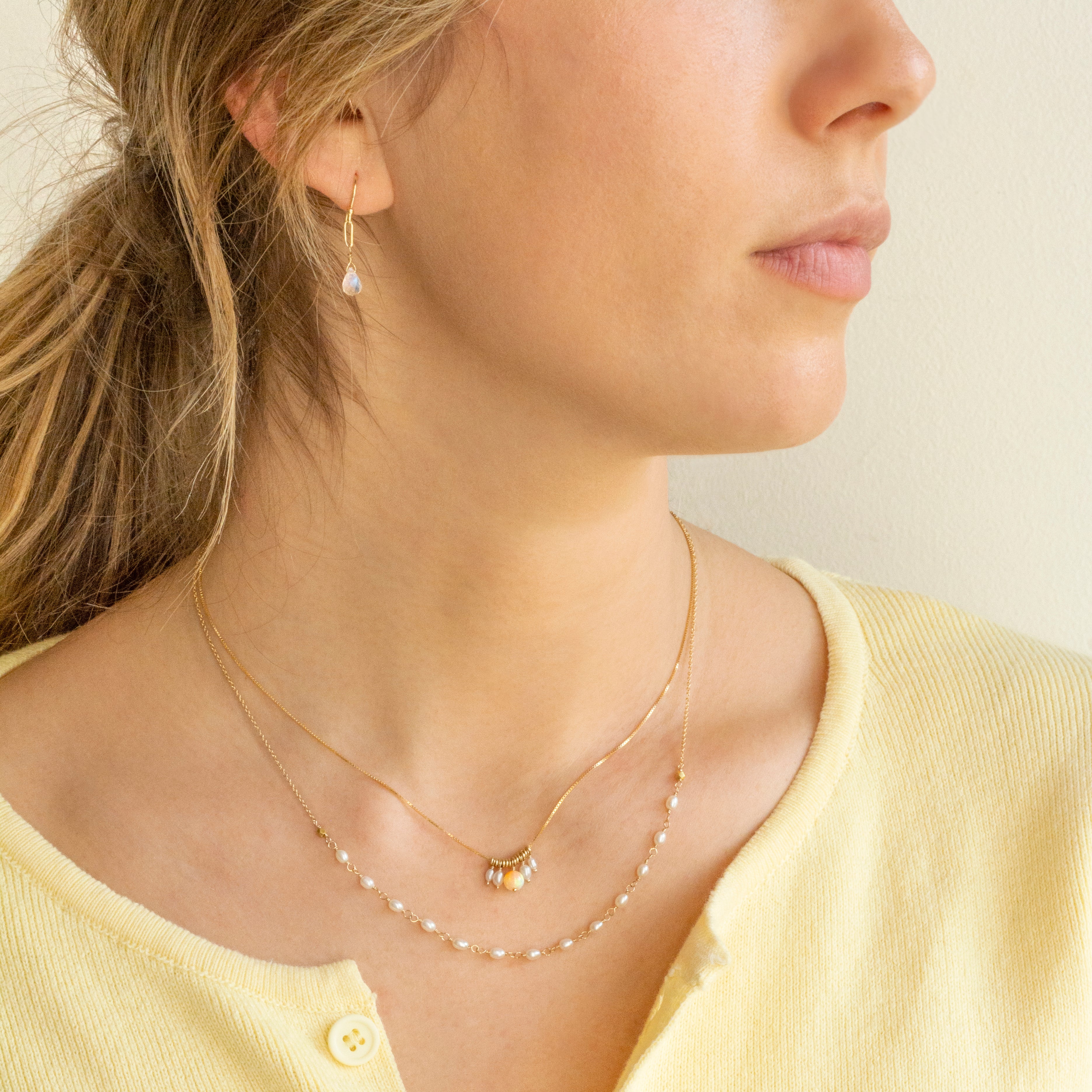 Our simple and elegant 'Luna' necklace boasts a delicate strand of hand tied freshwater pearls on a fine 18k yellow gold chain.