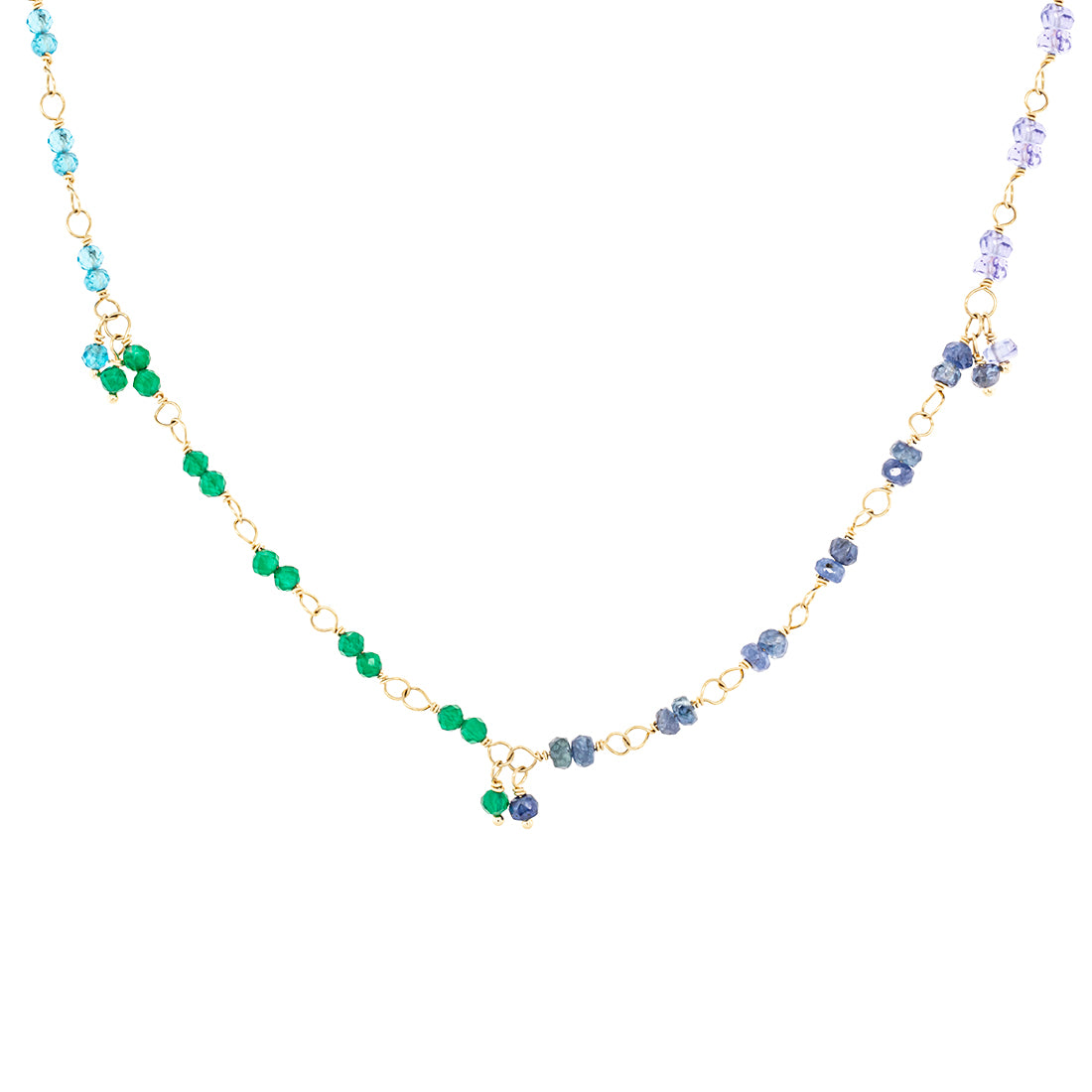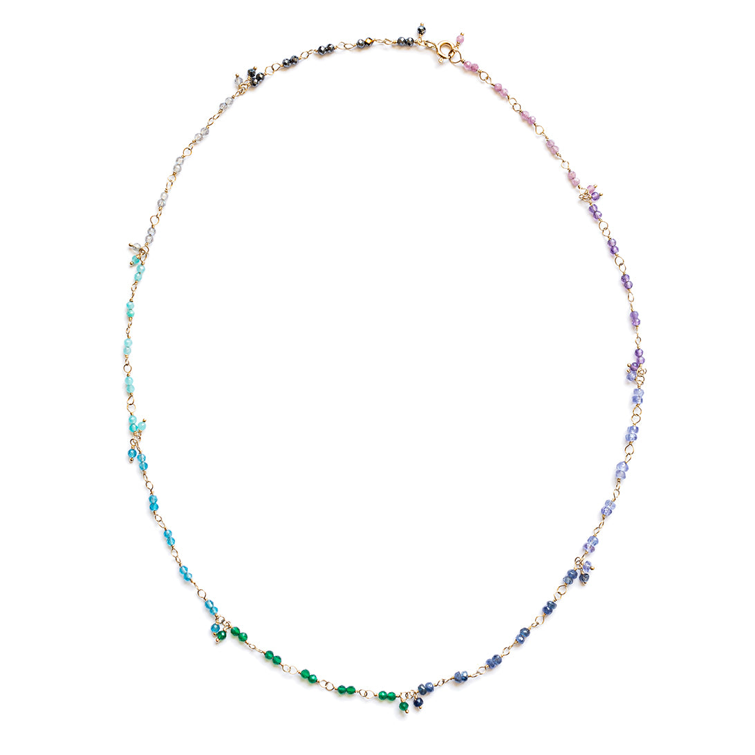A delightful rainbow spectrum of precious gemstone beads handtied in gold with sweet single stone dangles