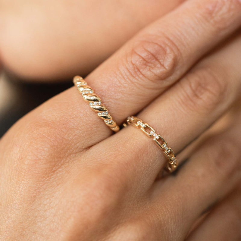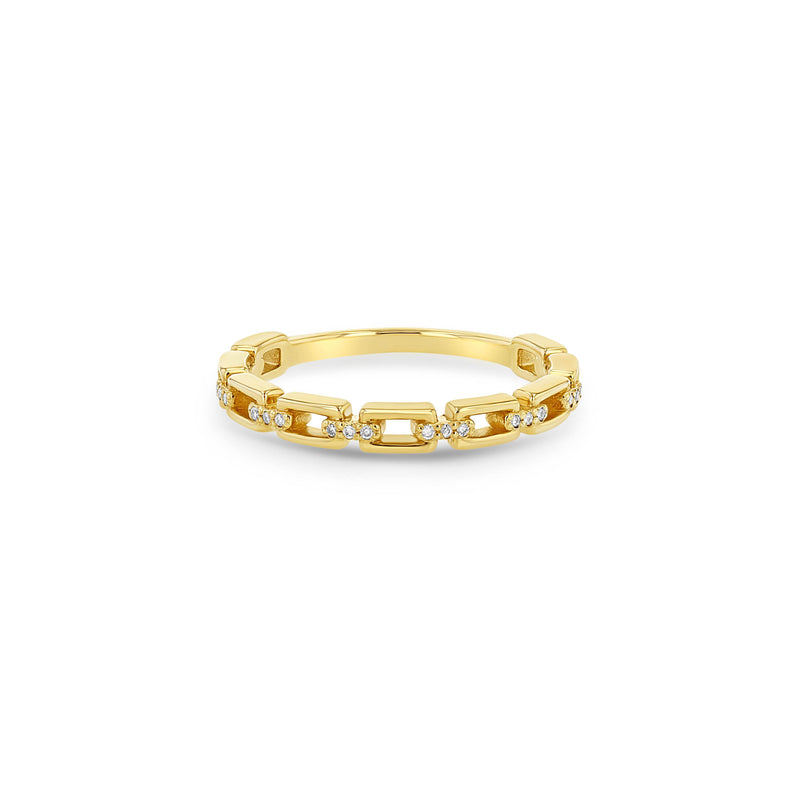 14k gold solid rectangular chain link band ring with pavé diamonds set in each connecting link and a flat base shank for comfort.