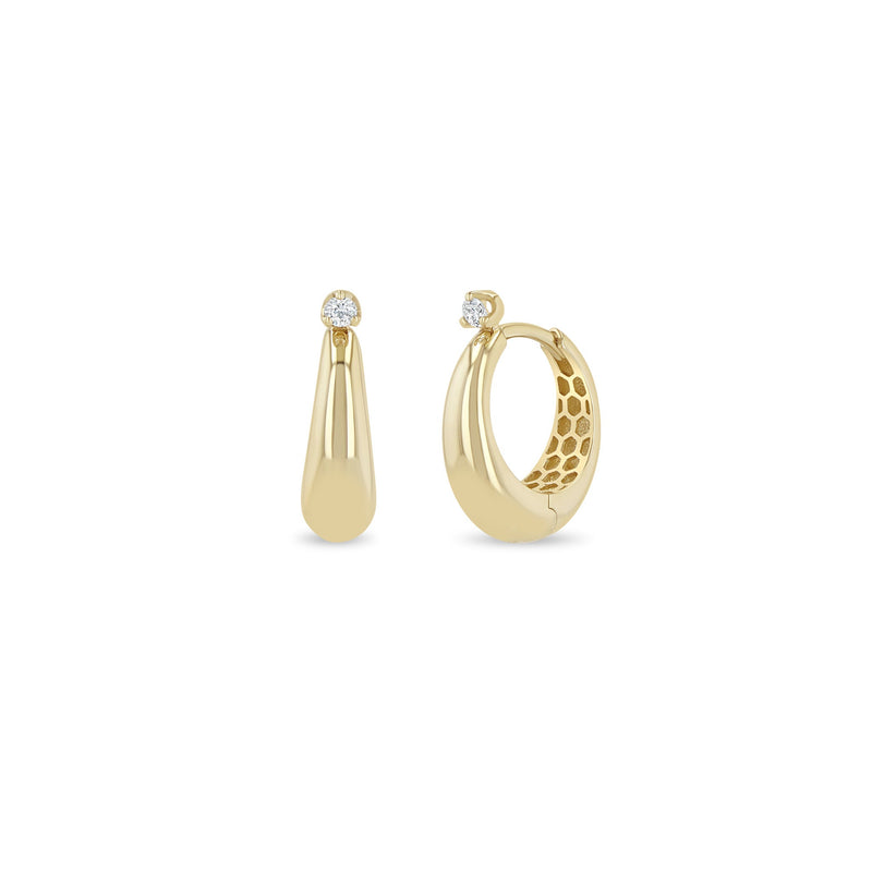 14k gold tapered hinged hollow hoops with prong set diamonds set at the top