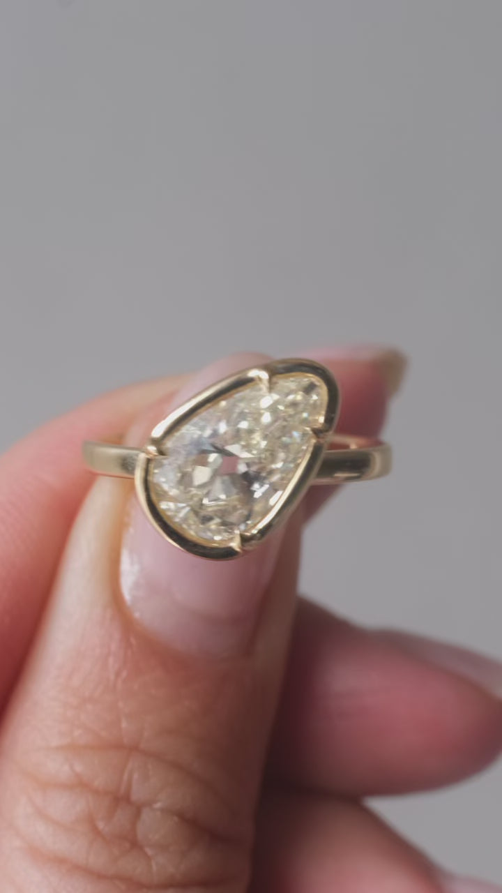 Bold and full of character; featuring a warm colored tilted vintage pear diamond in a 'Haley' setting.