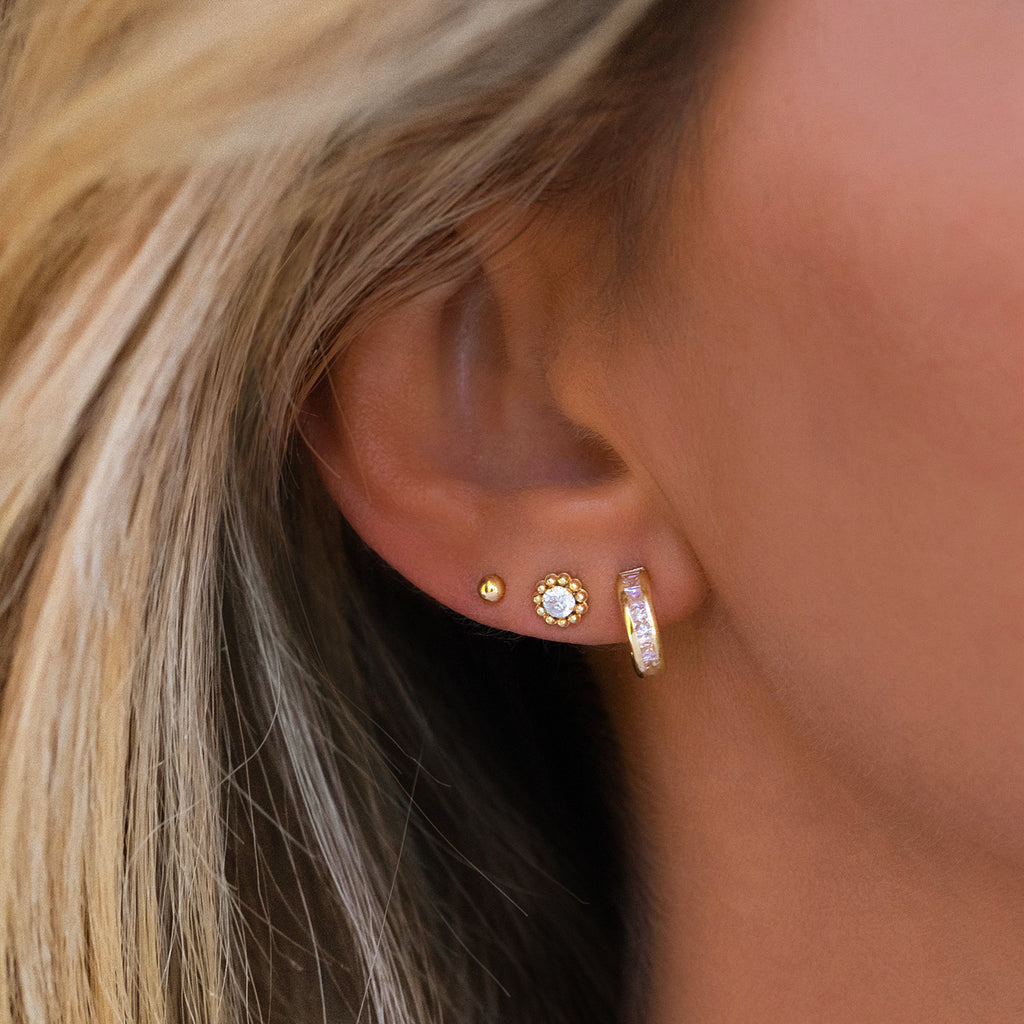 The studs that go with everything. Brilliant CZ’s surrounded by delicate beaded detail. Your lobes will love these.