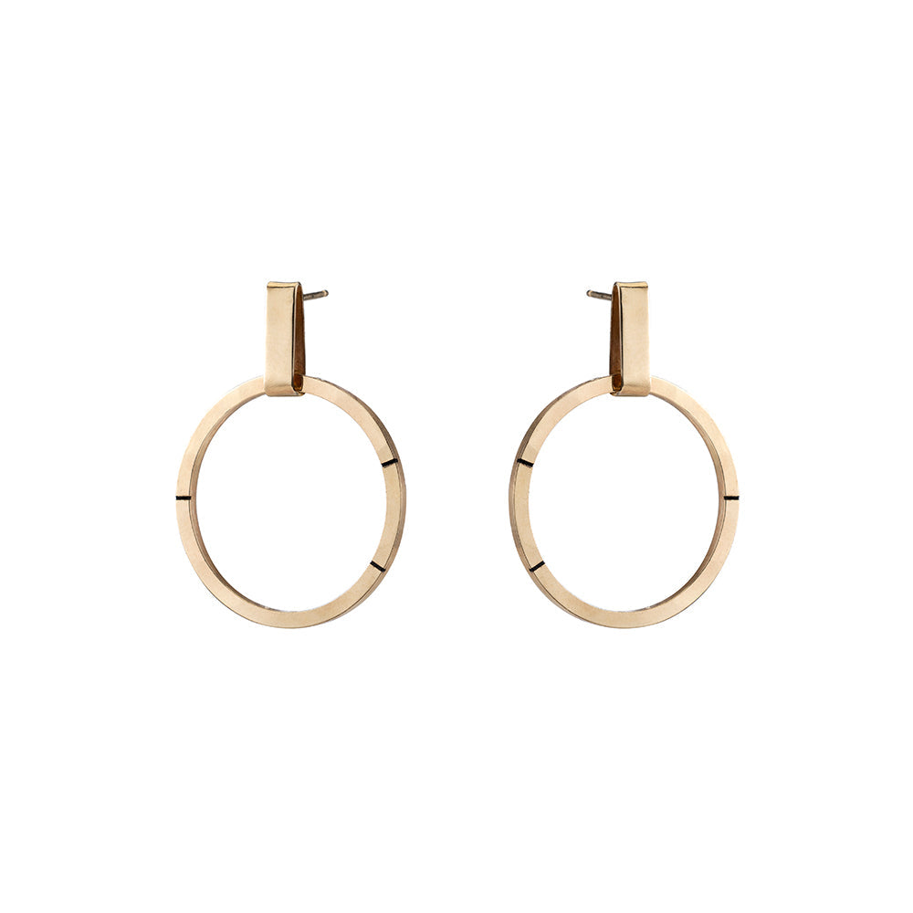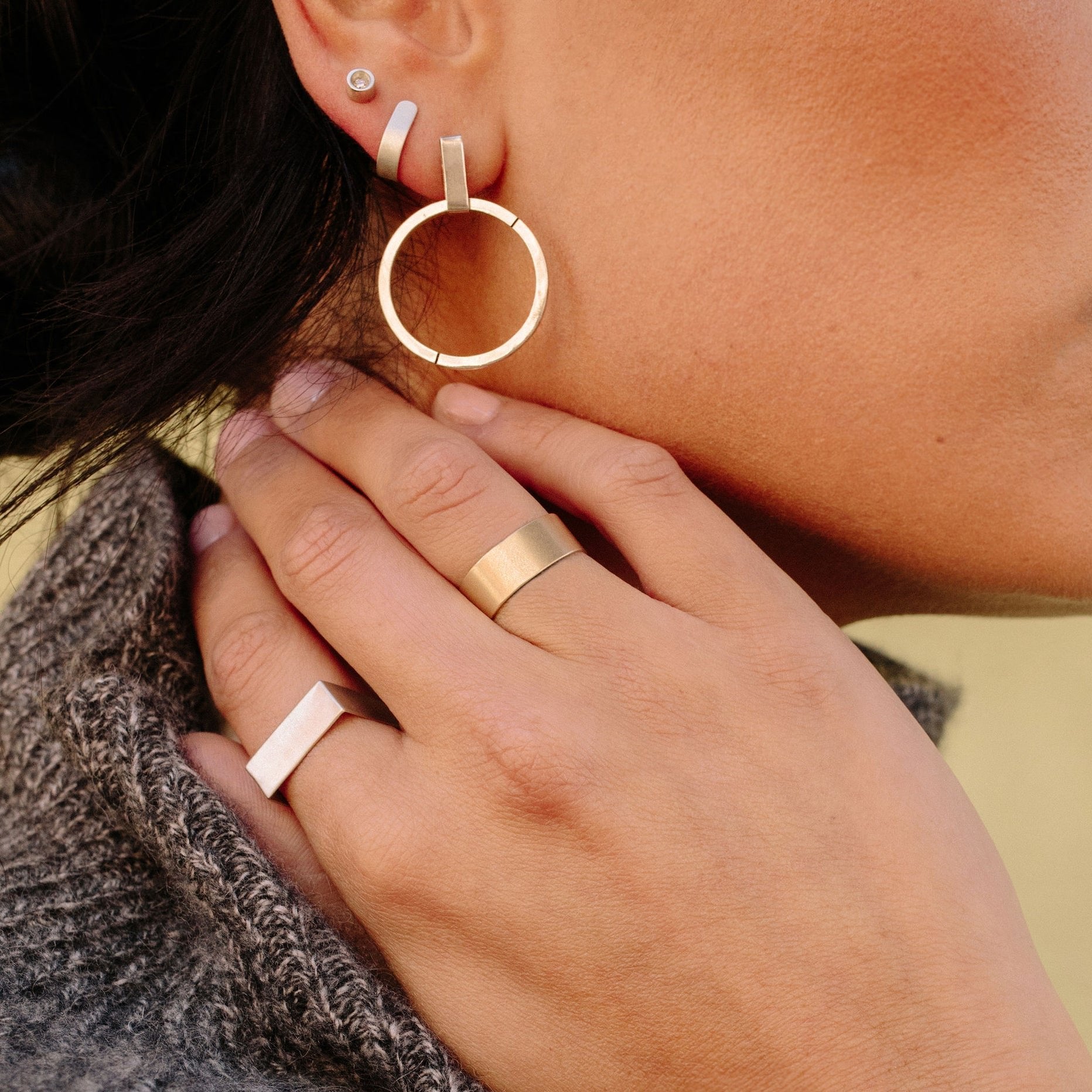 Our "Concept" post earrings measure 1.7/8" x 1.0". The circle has three hand-carved lines and it dangles from a triangular piece of metal that has a post attached it.