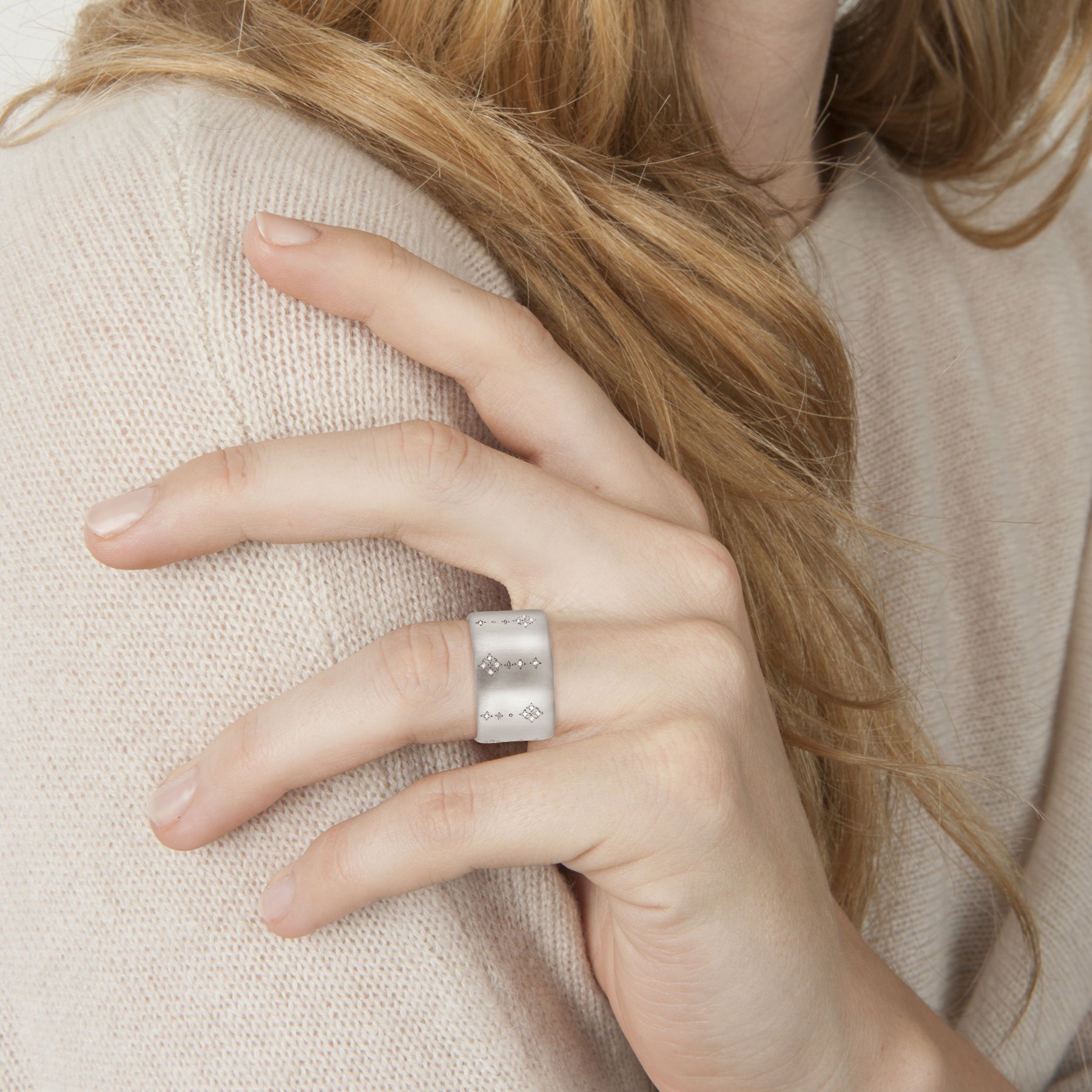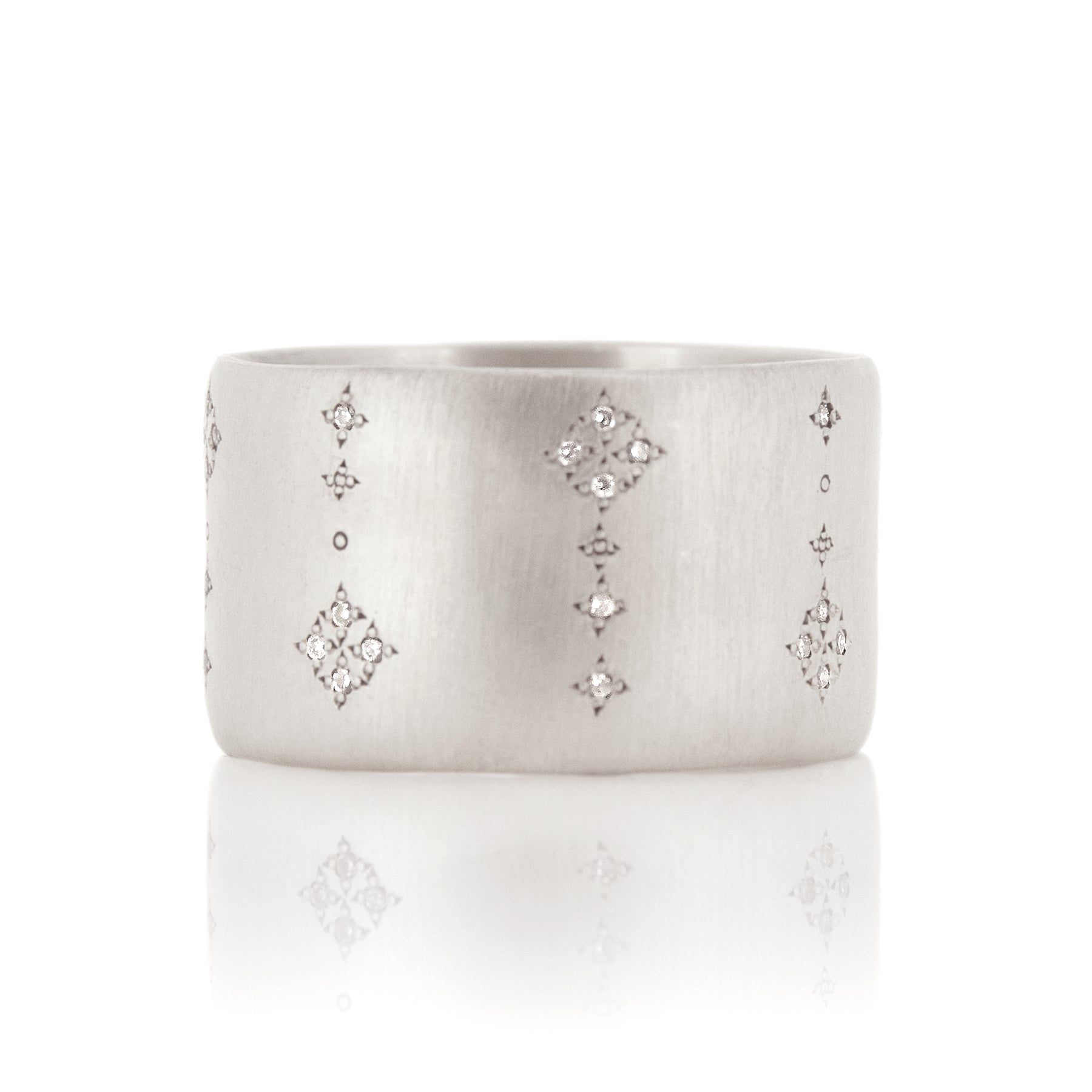 A gorgeous thick sterling silver band with diamonds reminiscent of a night sky filled with stars.