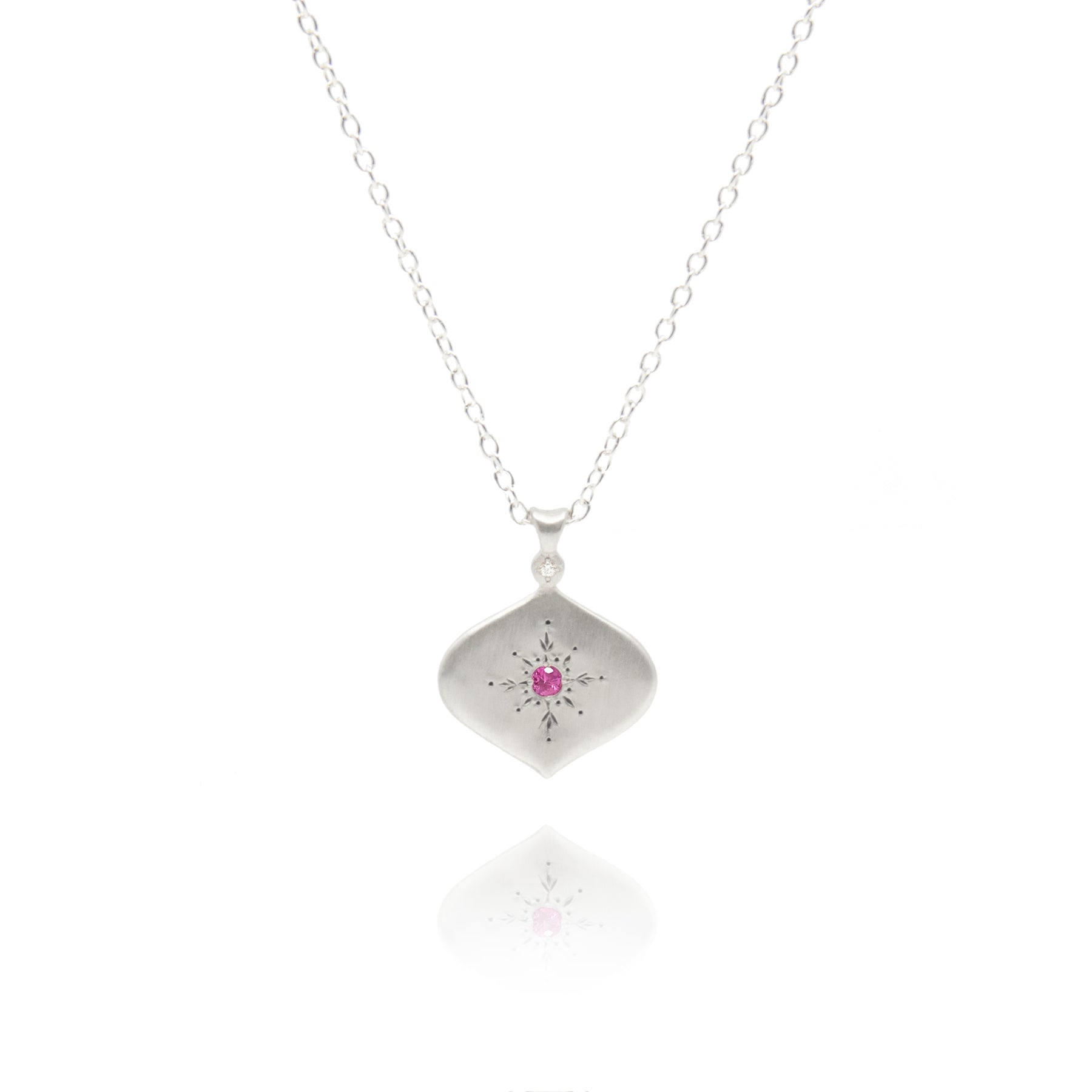 A single pink sapphire is placed in the center of a beautiful hand engraved design. A single diamond is placed on top to accent this North Star pendant.