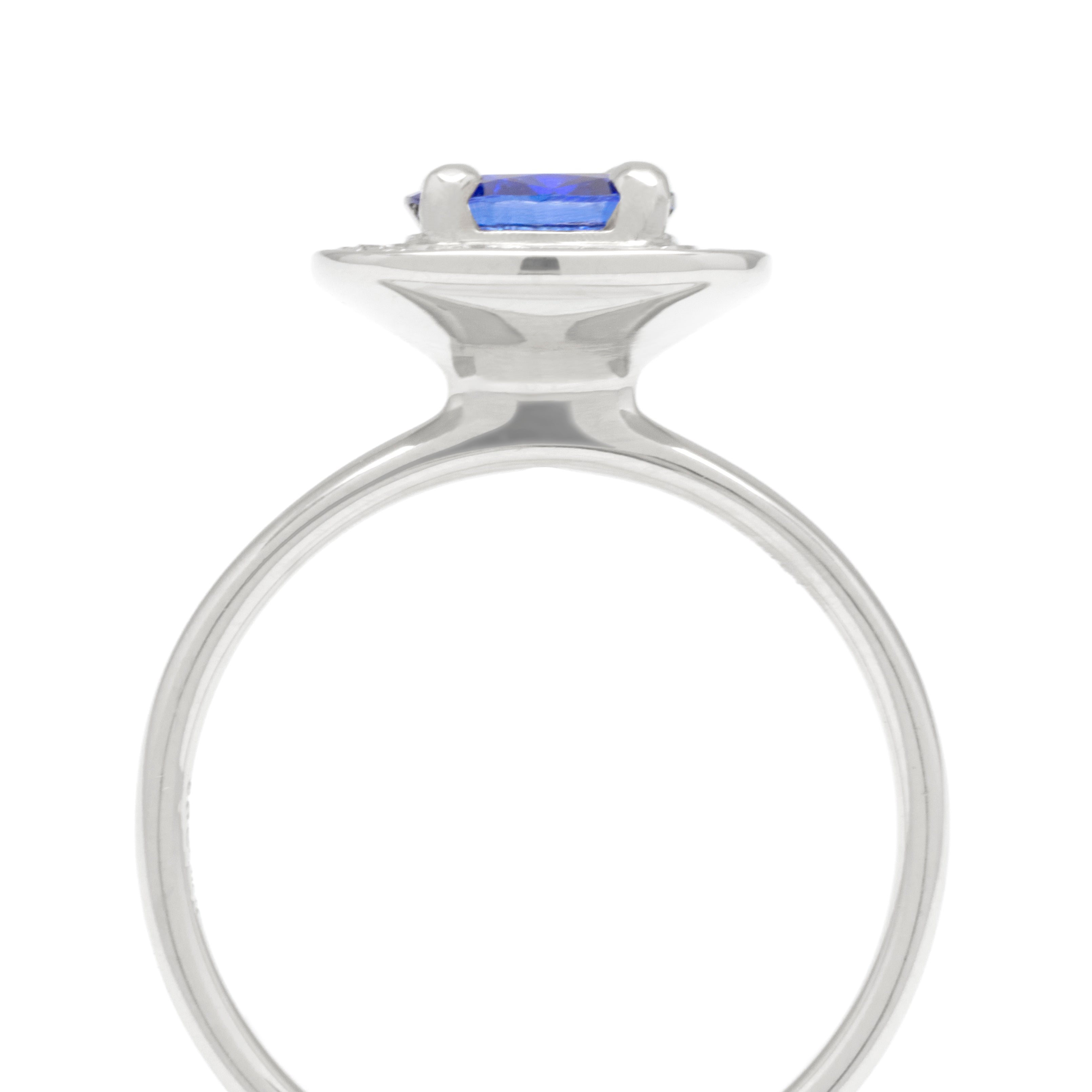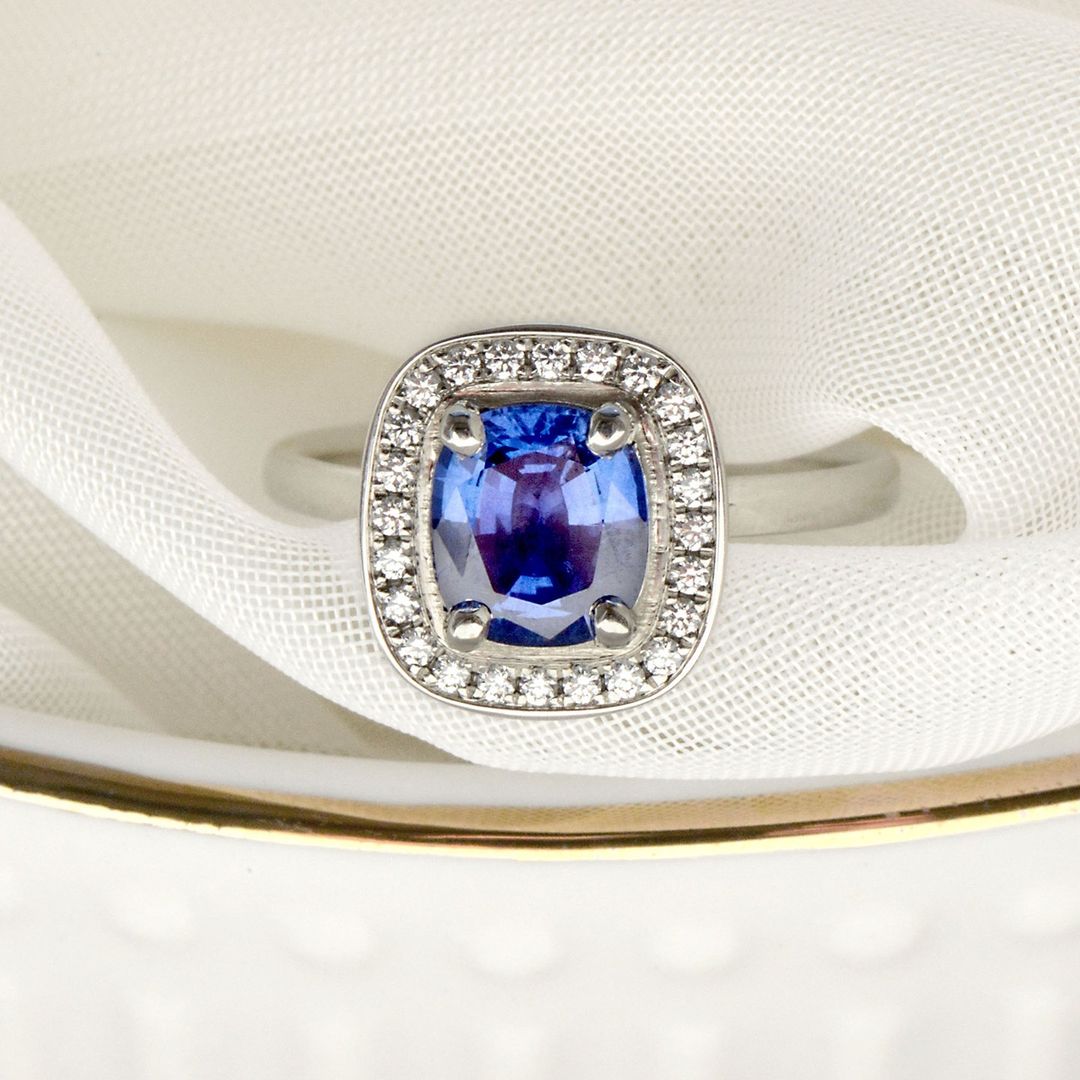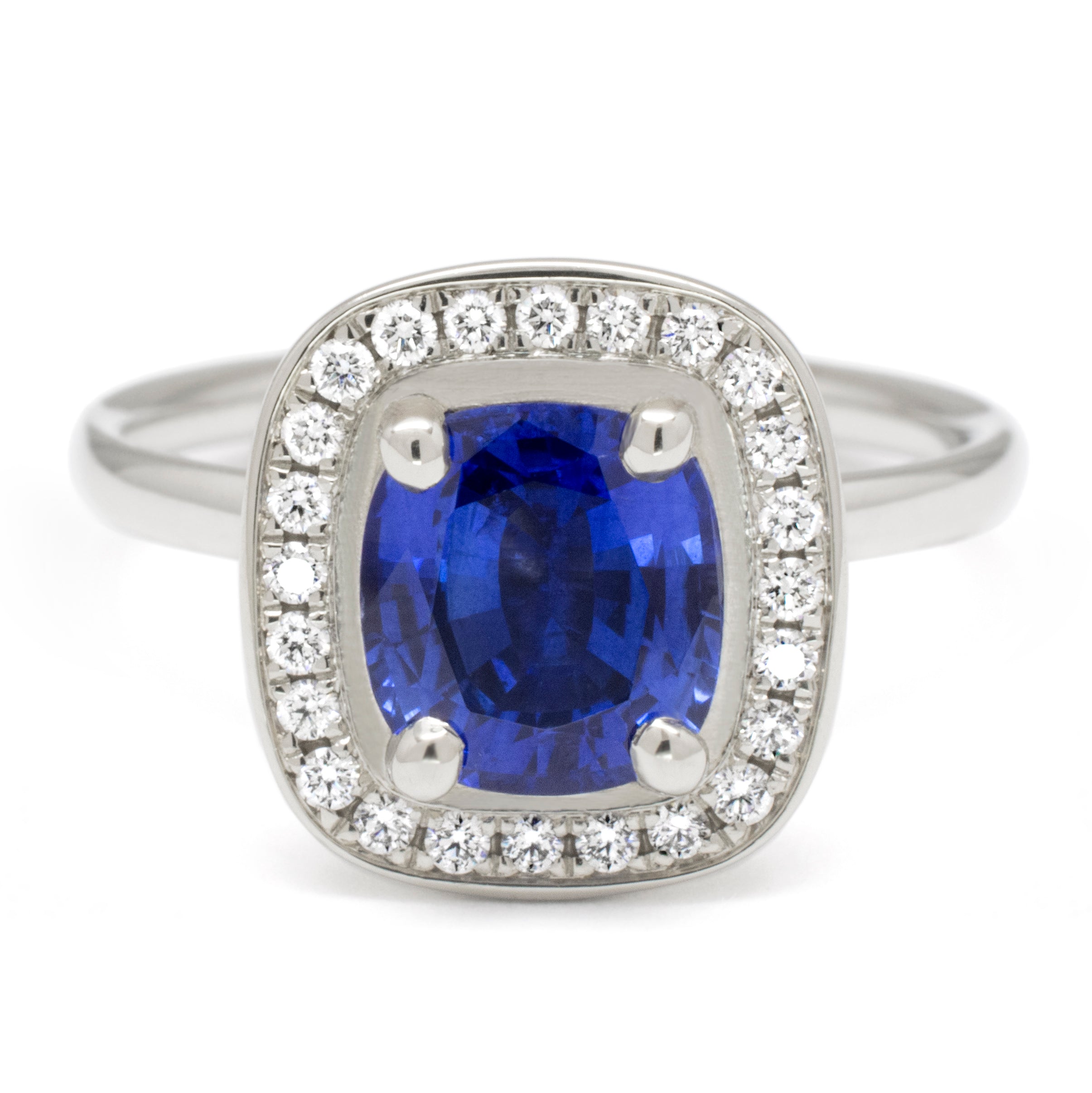 14k white gold ring with 1.47ct brilliant blue cushion cut sapphire, claw set with pave diamond halo (24x.006ct brilliant cut white diamonds).