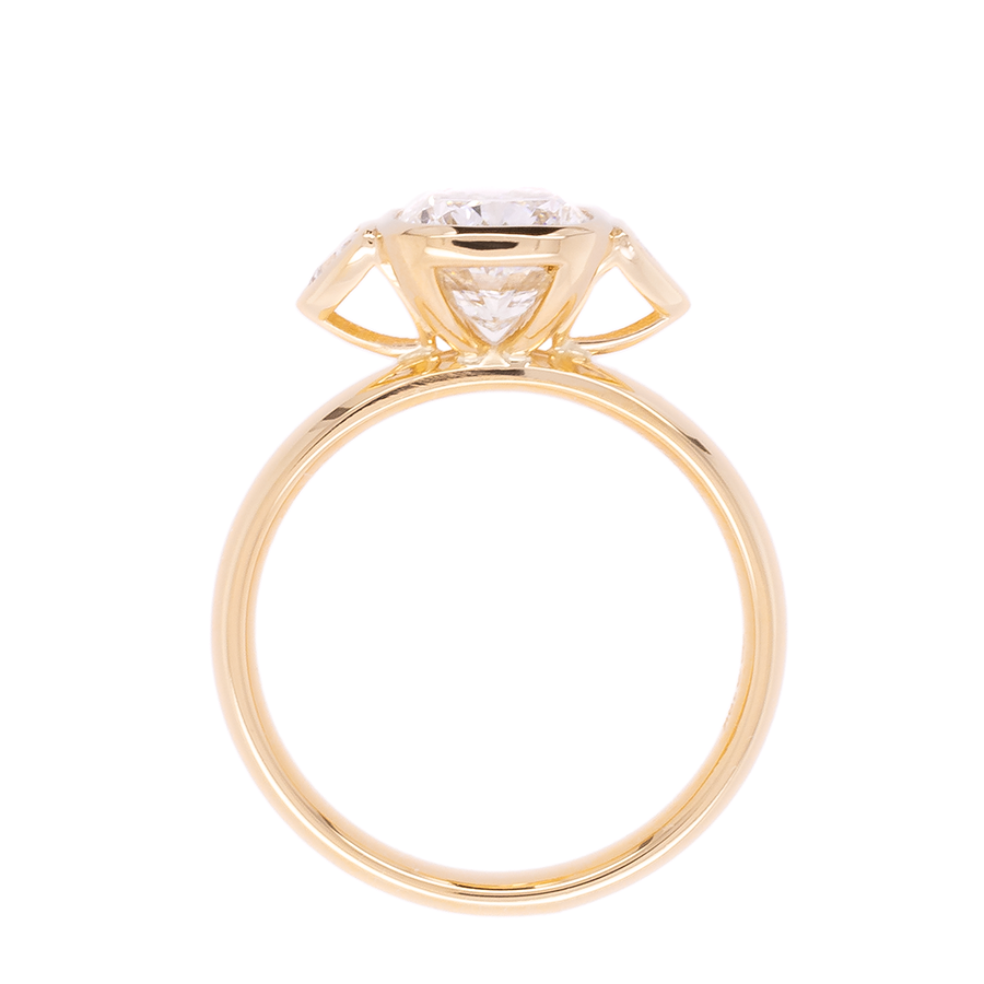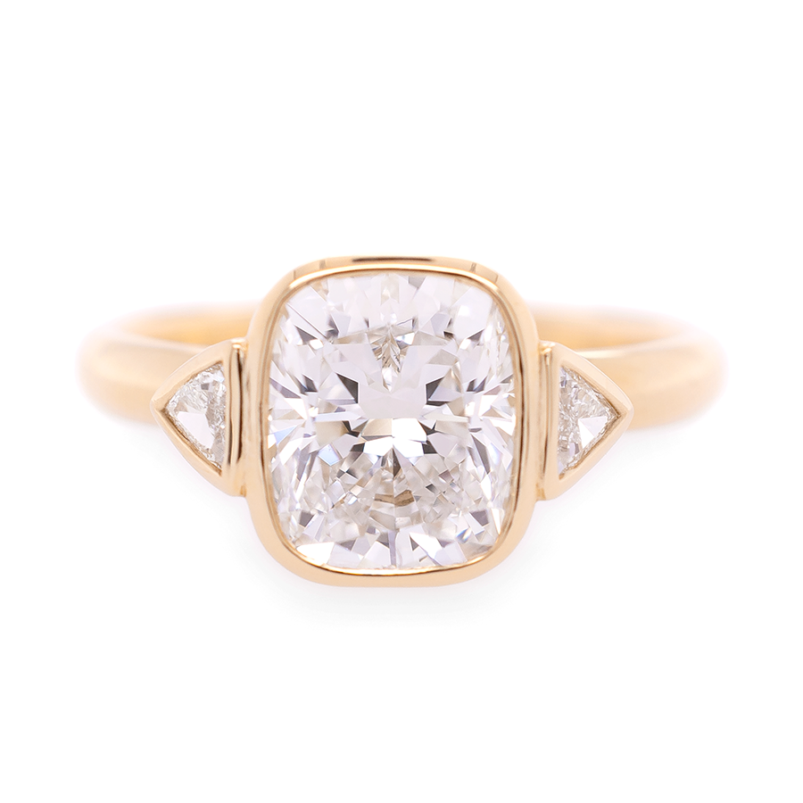 2.07ct Cushion Diamond set in High Polish 18k yellow gold Cage Bezel Setting with 3.1mm Trillions Side Stones. 2.5 x 1.7mm Comfort Fit Band.