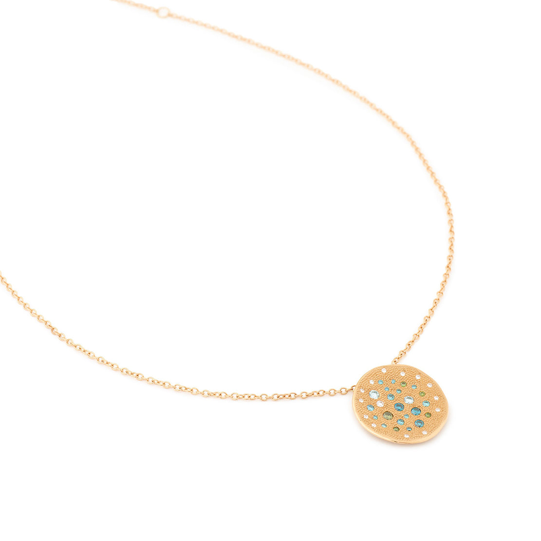 Gold Seafoam organic circle pave set blue, green and white diamonds.