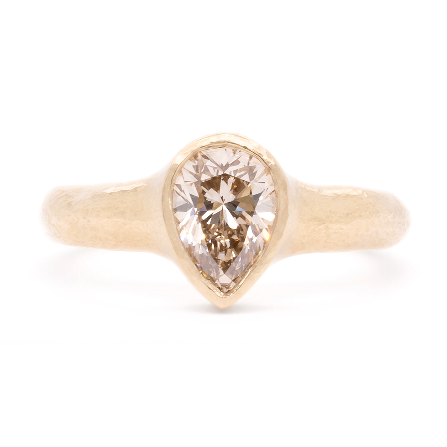 This Micro Hammered Champagne Pear Diamond Ring is a great choice for those seeking a low profile ring with a unique and organic shape. The micro hammered texture adds to the sparkle of the diamond. Unique, yet timeless.