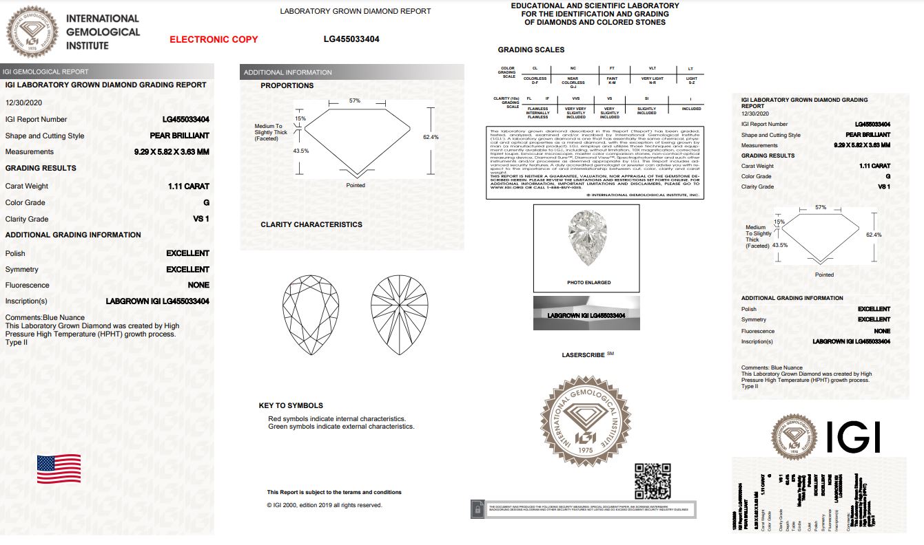 | Comments | Blue Nuance This Laboratory Grown Diamond was created by High Pressure High Temperature (HPHT) growth process Type II |