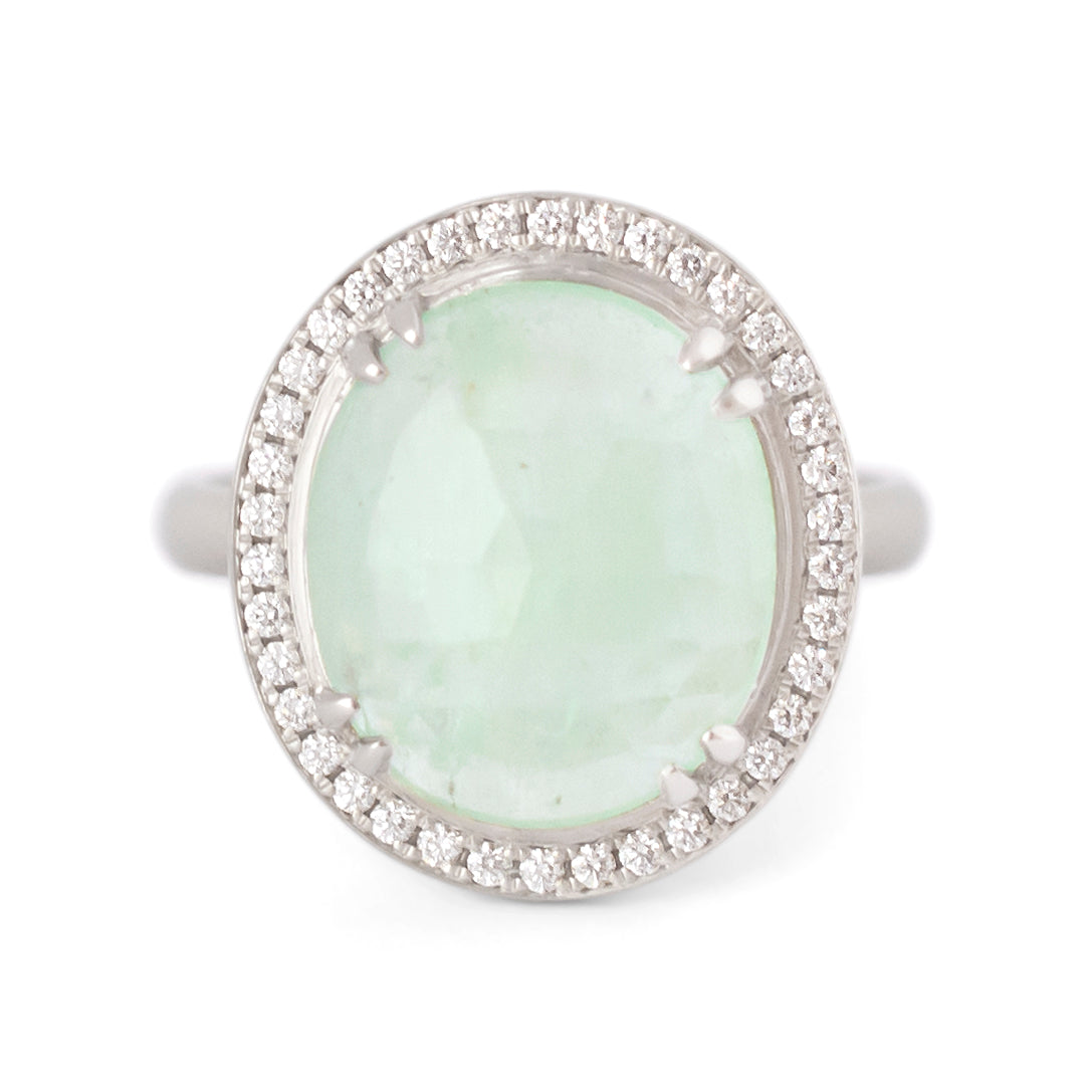 5.40ct light green oval rose cut (~12.1x14mm) emerald double claw set surrounded by 38x.005ct rbc pave set white diamonds in 14kw gold. Band ~2.40mm wide.