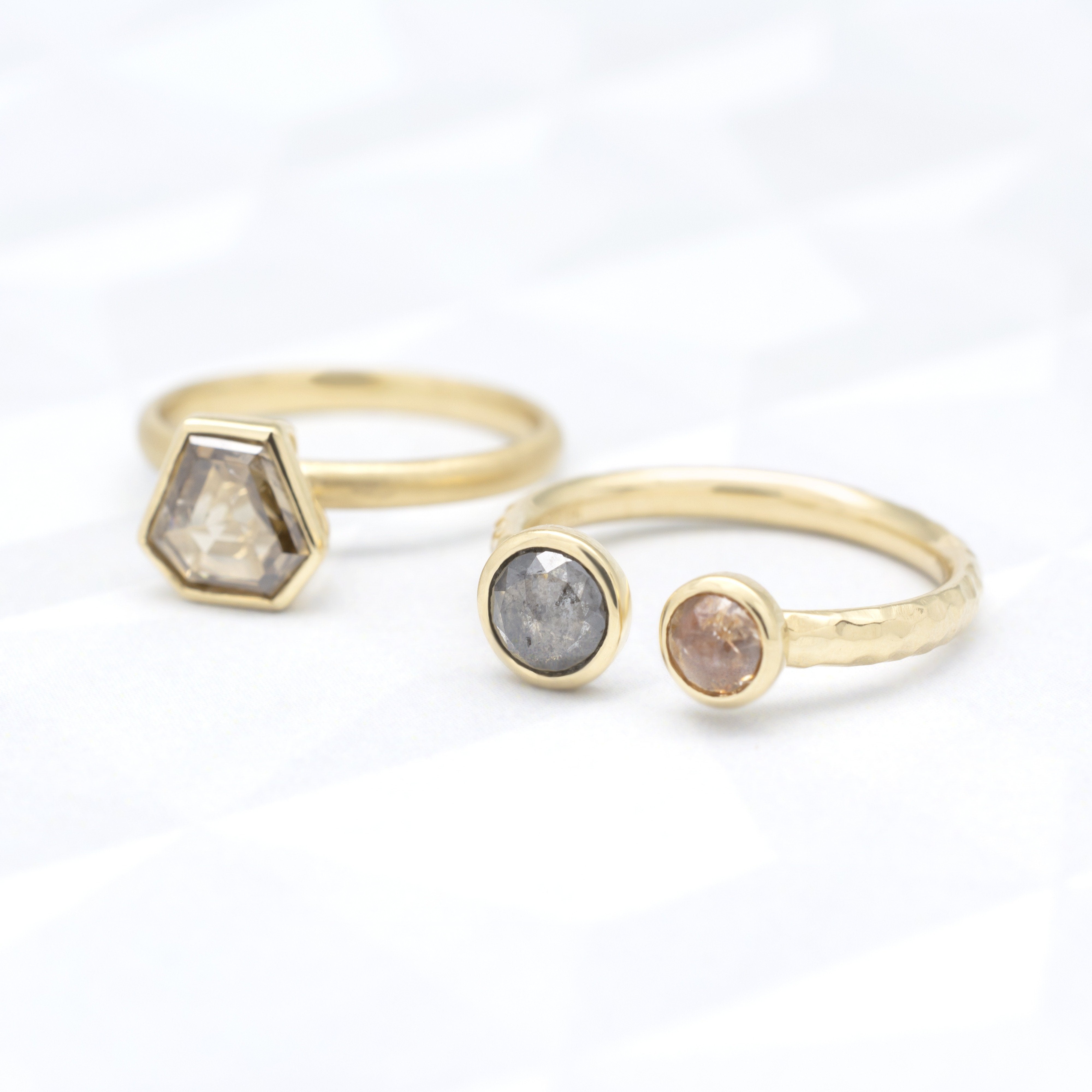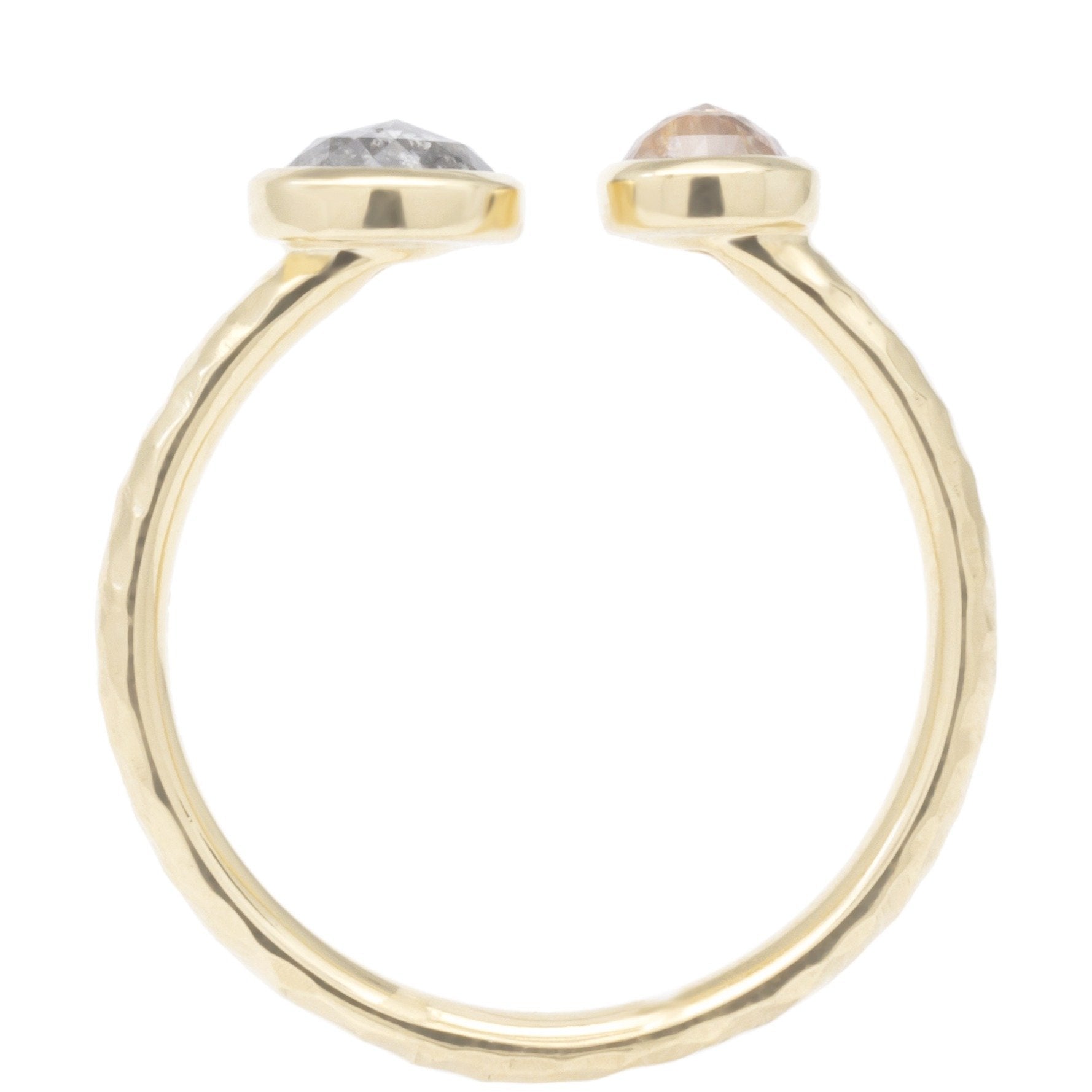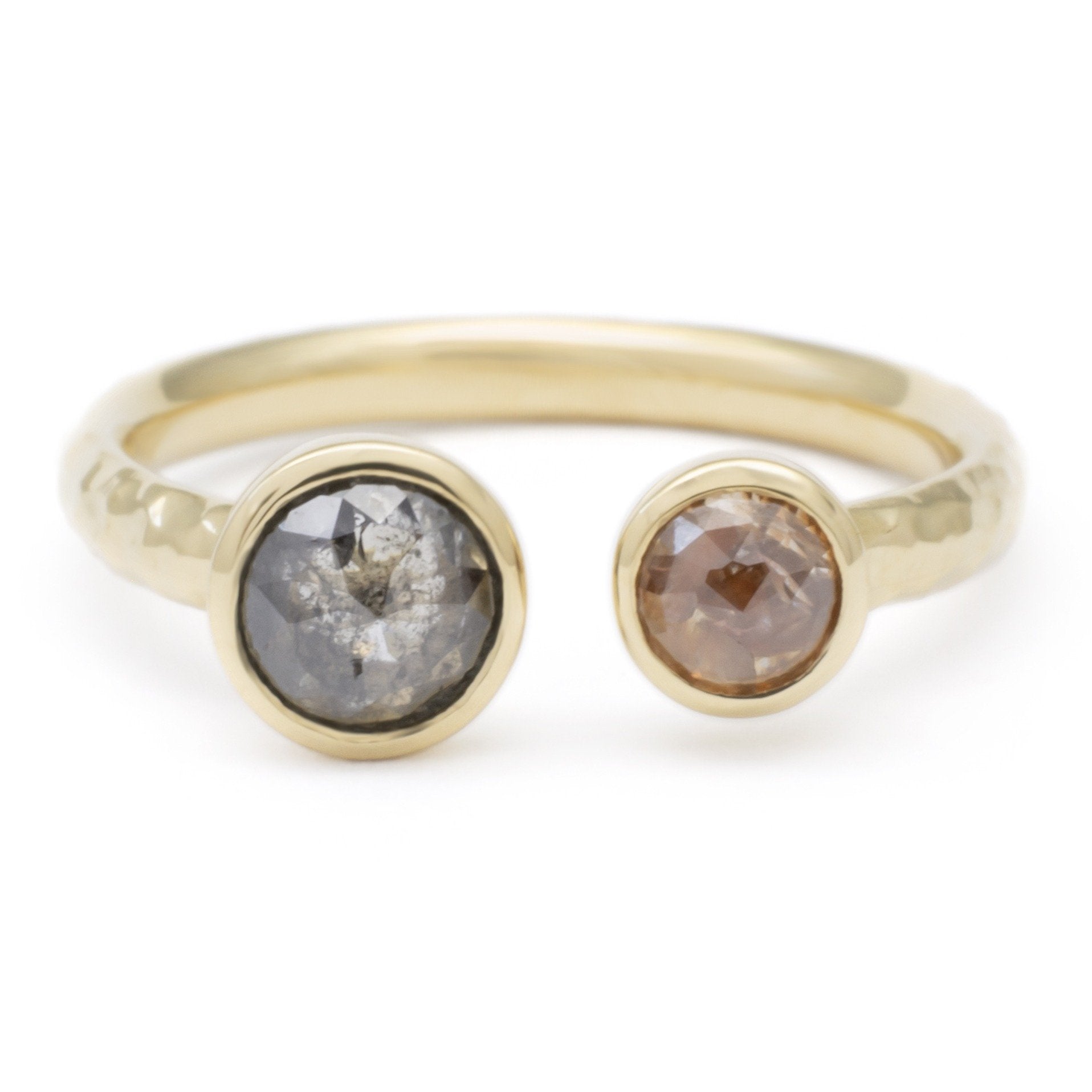 One of a Kind 18k yellow gold open ring with 1 x 1.5ct salt & pepper round rosecut diamond and 1 x 1.31ct caramel round rosecut diamond, 2.4mm hammered band.