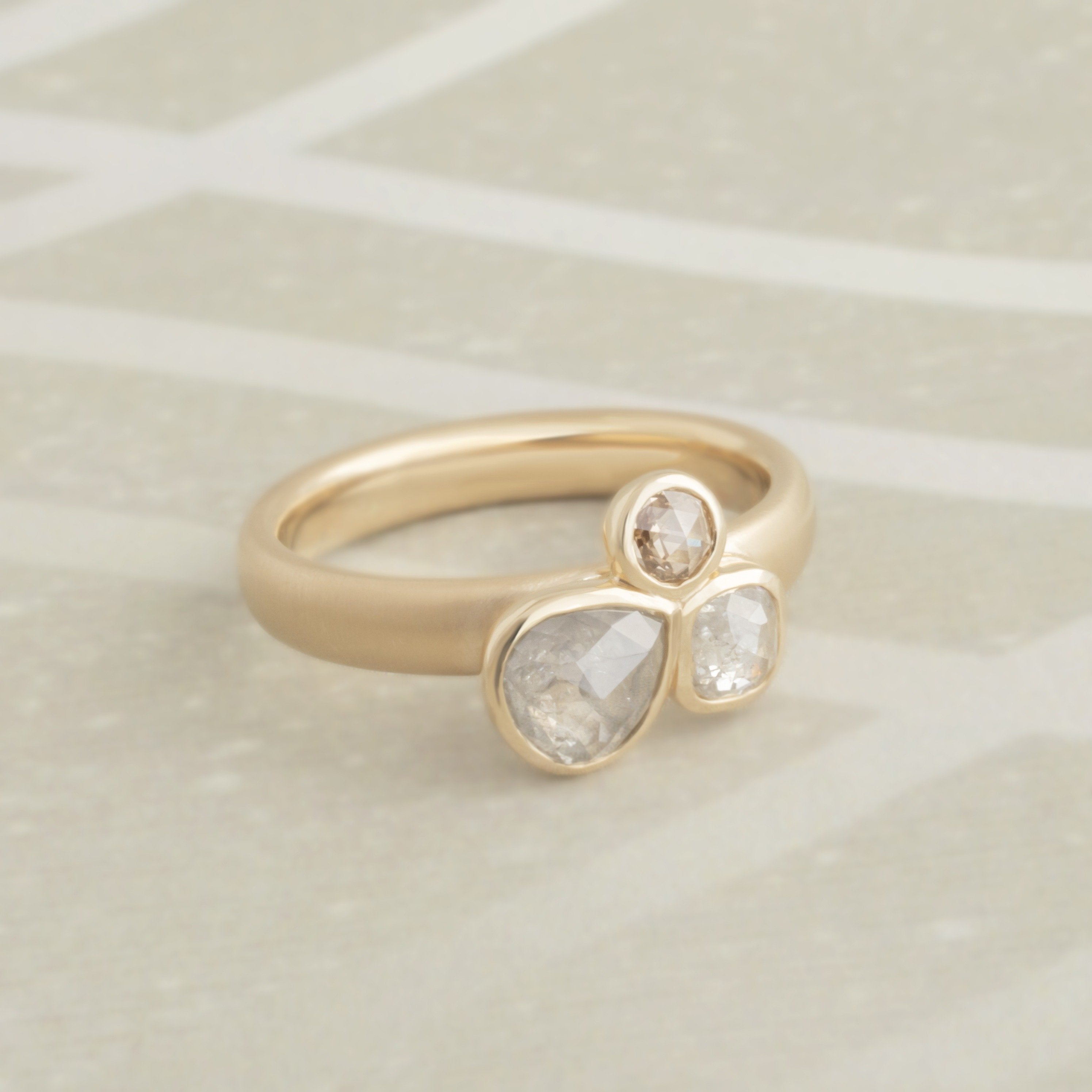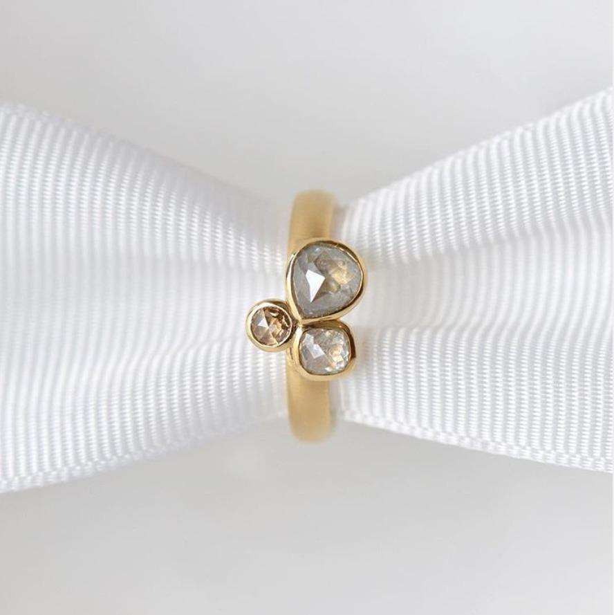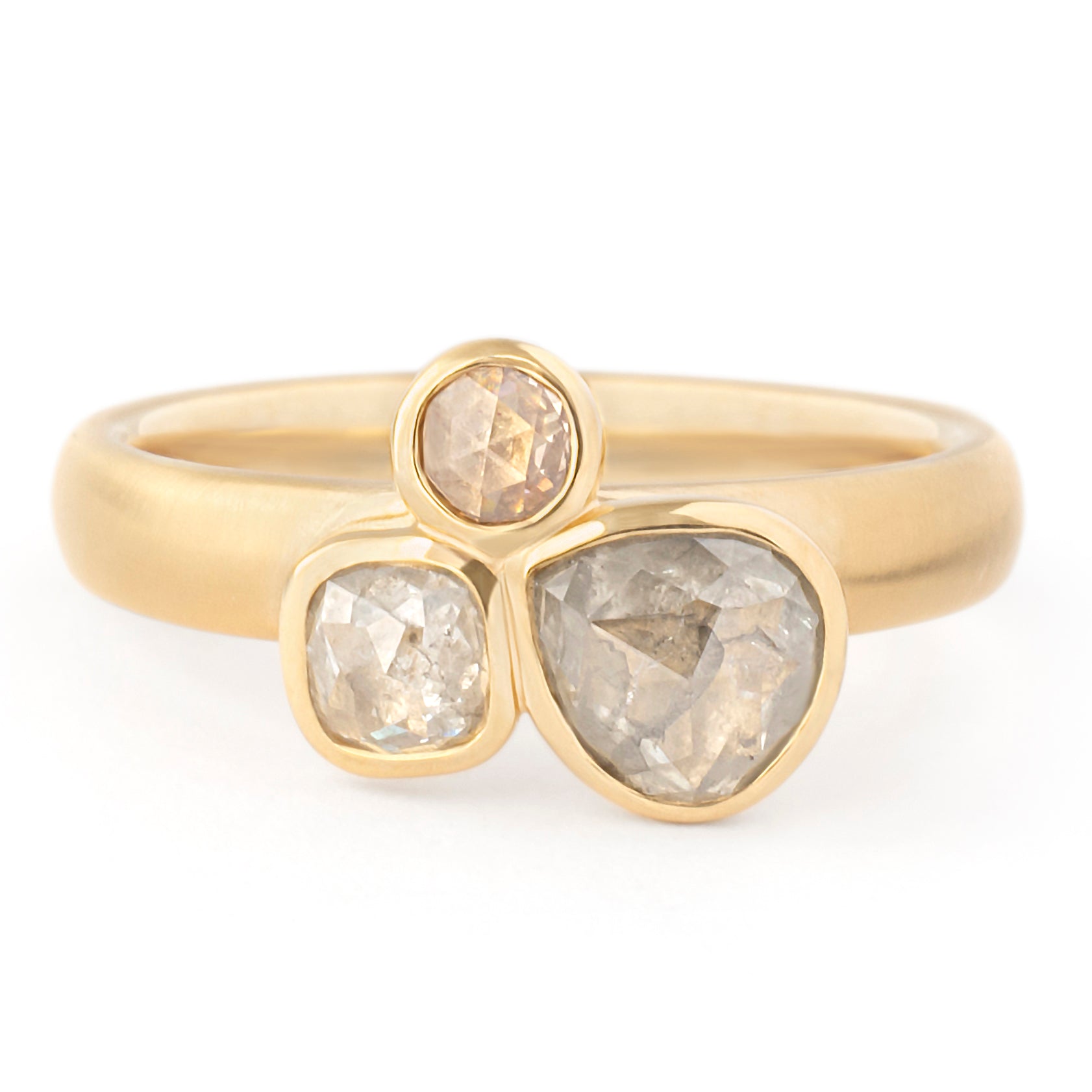 One of a kind 18kt yellow ring with triple raw rosecut diamond cluster; bezel set 1 x 0.61ct grey pear, 1 x 0.24ct clear cushion, 1 x 0.08ct cognac round. 3.4mm hammered band.
