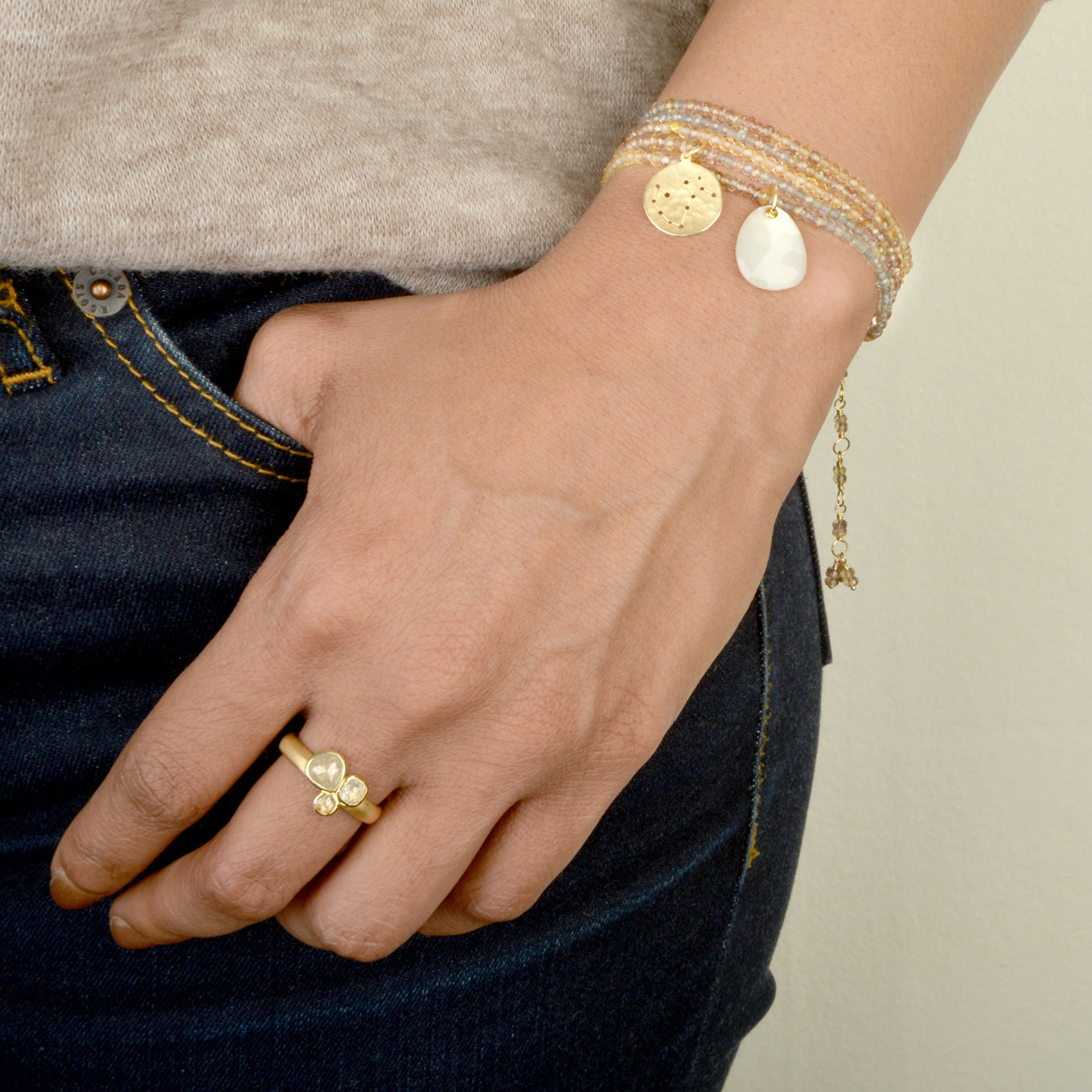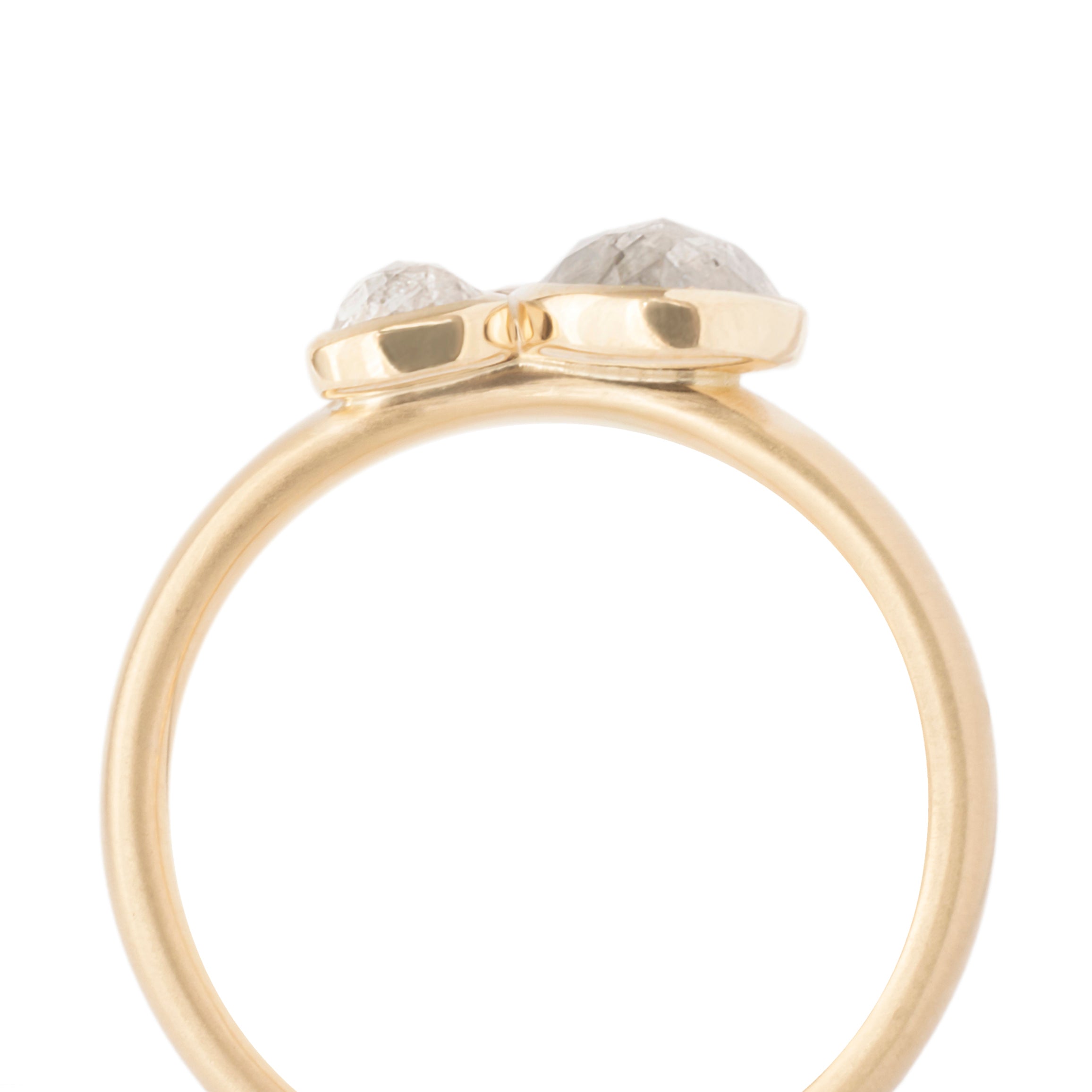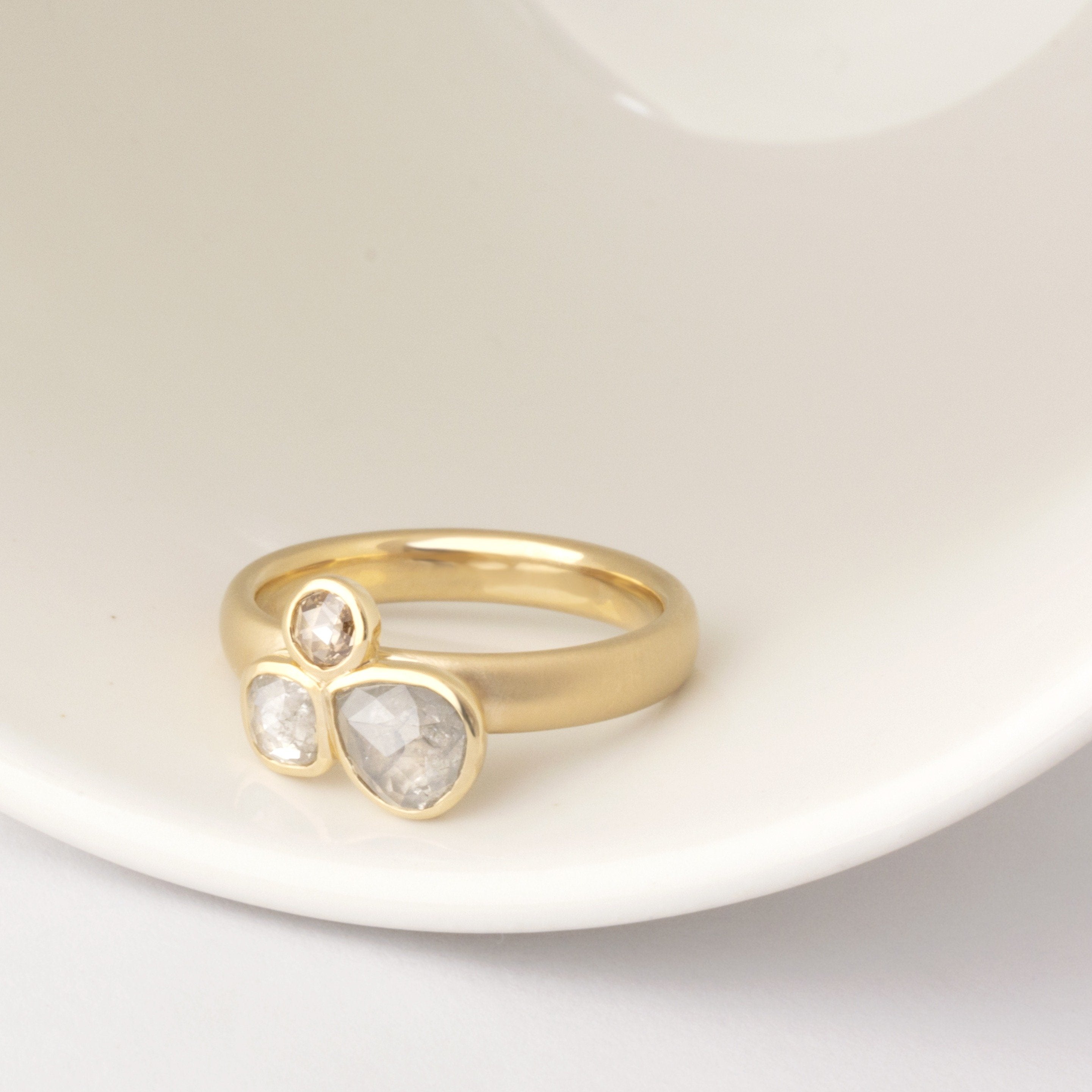 One of a kind 18kt yellow ring with triple raw rosecut diamond cluster; bezel set 1 x 0.61ct grey pear, 1 x 0.24ct clear cushion, 1 x 0.08ct cognac round. 3.4mm hammered band.