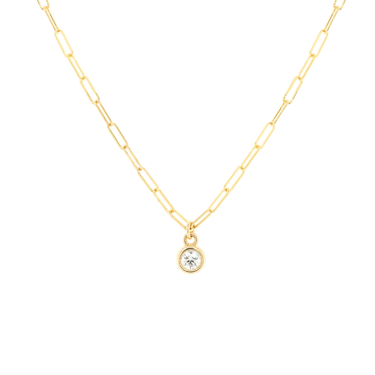 One of a kind necklace: Sparkling round brilliant diamond hand carved and bezel set in solid 18k yellow gold pendant charm on a 14ky gold paperclip chain.